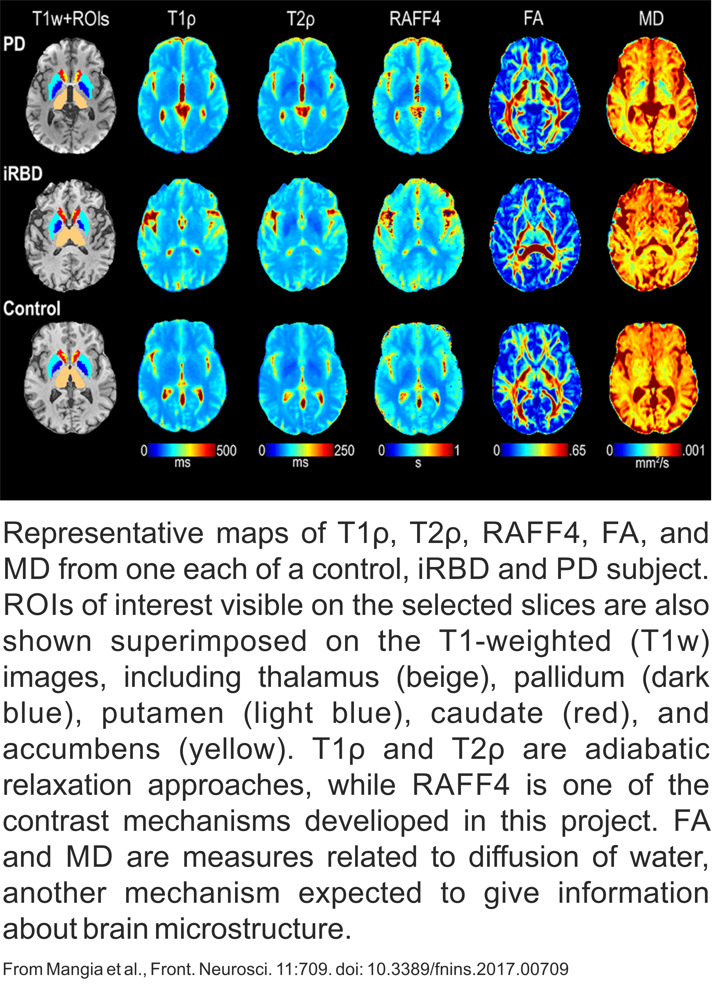 Given the complex features of microstructural damage, it is likely that a multiparametric integration of different metrics is needed, where the new approaches we propose are intended to complement other quantitative techniques. MRI in itself lends naturally towards multiparametric studies, because it can produce images sensitized to multiple contrast mechanisms, as described above. MRI can also be combined with compatible approaches, including PET based molecular imaging, electrophysiological measurements and neuromodulation. In this project, we implemented an appropriate set of processing tools to combine different kind of information. Main results obtained with this approach are related to Parkinson Disease (PD) and the associate idiopathic REM sleep behavior disorder (iRBD). We were able to show that rotating frame relaxation methods, along with functional connectivity measures, are valuable to characterize iRBD and PD subjects, and with proper validation in larger cohorts these approaches may provide pathological signatures of iRBD and PD.