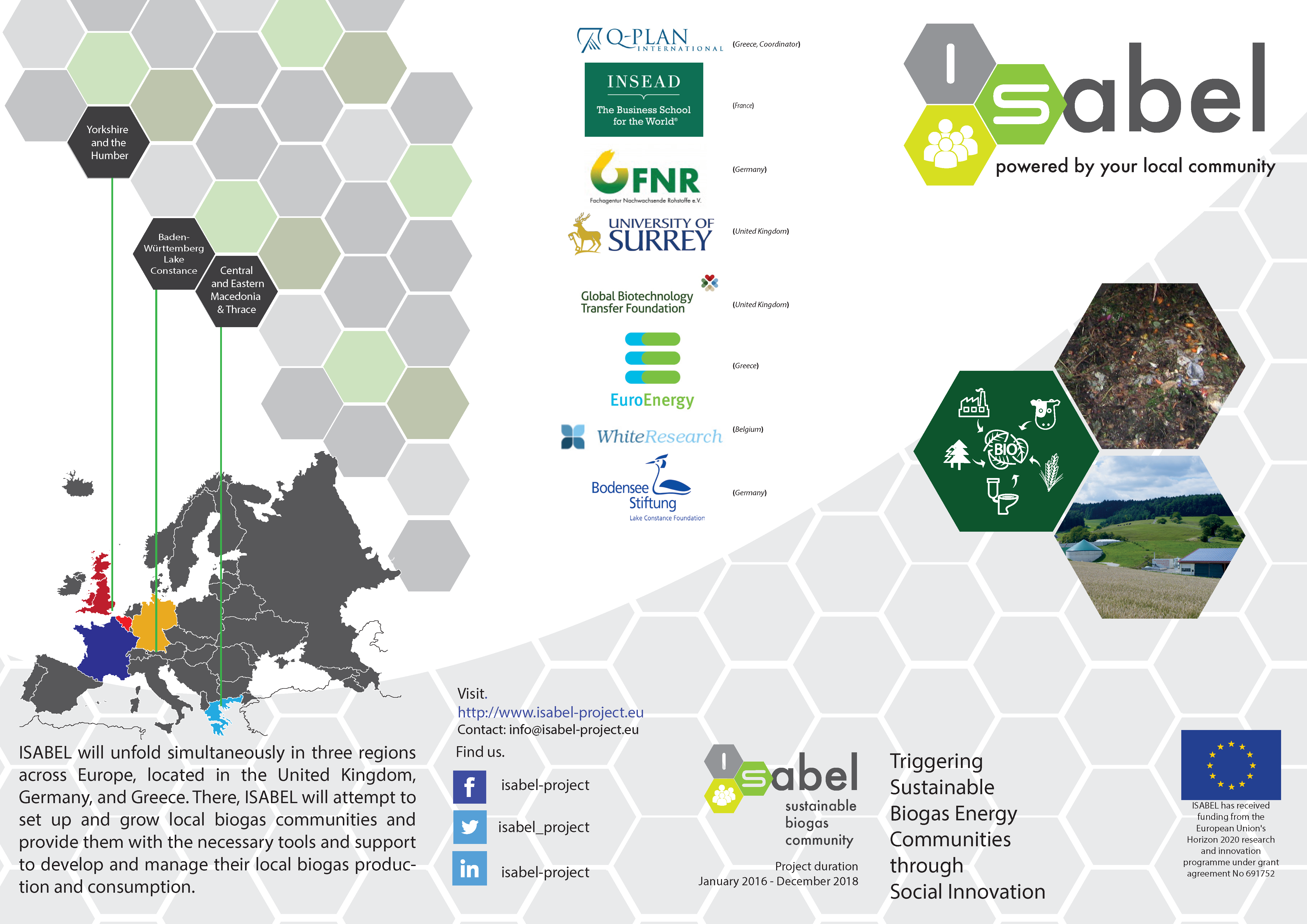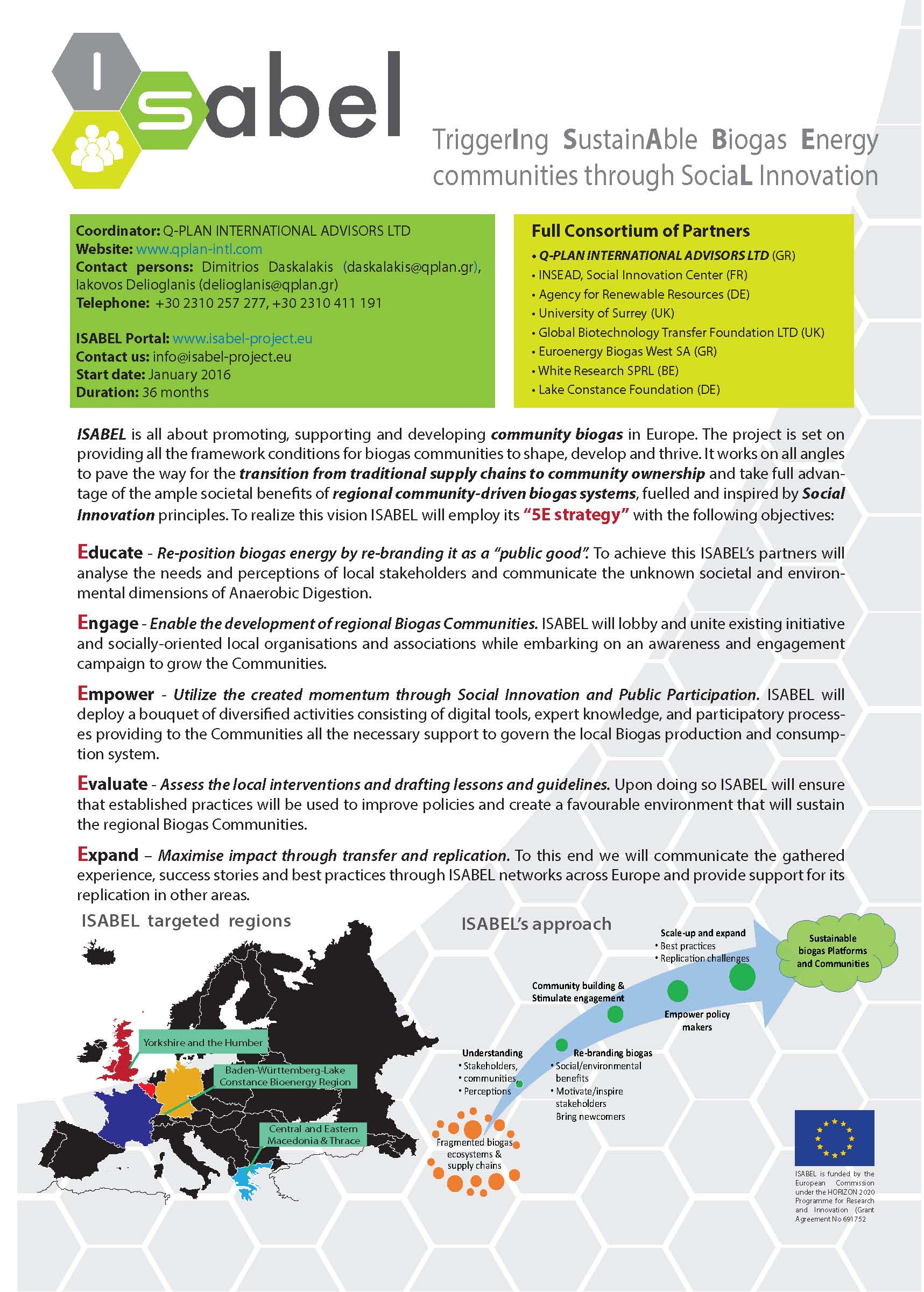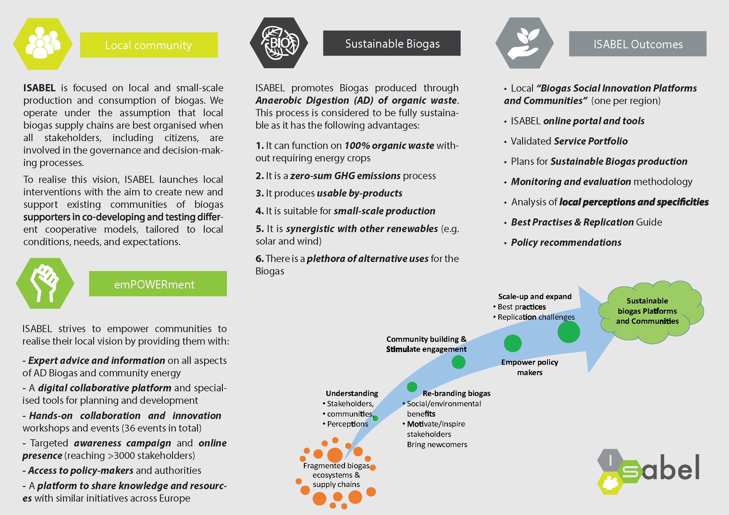 The ISABEL project aimed to strengthen the development of sustainable biogas production-consumption systems around Europe by taking advantage of sustainable biogas' growth potential. By introducing Social Innovation and engaging all types of stakeholders at regional/local level (biomass owners such as farmers and breeders, biogas producers, local/regional authorities, NGOs, citizens (consumers), etc.), the project focused on promoting, stimulating and supporting the creation and operation of community energy initiatives. that can bring multi-dimensional (economic, environmental and social) benefits to the local communities.