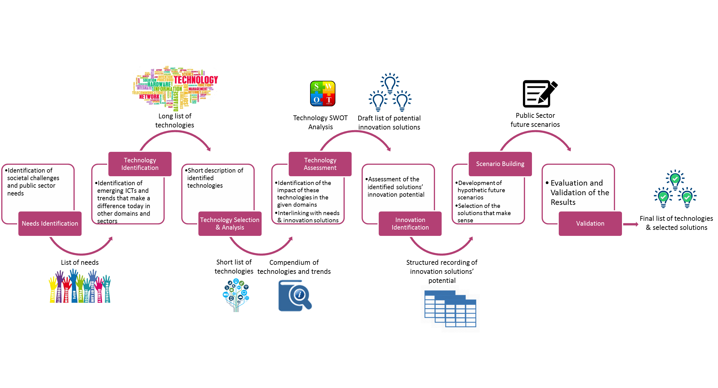 In order to fully exploit the benefits of ICTs to help the public sector meet emerging societal needs, SONNETS has designed the SONNETS Innovation Identification Framework that will accelerate the modernization of the public sector through the identification and analysis of emerging technologies that hold the potential to transform the public sector into a technology leader and innovation carrier, addressing, at the same time, the most pressing needs of the citizenship through 7 steps: (i) needs Identification, which comprises the first step described above; (ii) Technology Identification, in which a long list of technologies and trends was elicited from the initial pool of material. This list was refined through step (iii) Technology Pre-selection and Analysis; step (iv) Technology Assessment aimed at supporting the conduction of an adapted SWOT analysis, which targeted on the one side to assess the impact of the identified technologies and trends in the domains originally met, and to point out, on the other, opportunities for their adoption, usage and promotion by the public sector as well as potentially involved challenges and threats; in step (v) Innovation Potential Identification, the innovation potential of the technologies and trends identified in previous steps was assessed against two basic components: impact and feasibility; (vi) Scenario Building sets the scene for the application of the identified technologies and trends, and their respective solutions, into 2 hypothetical scenarios: the probable Public Sector (a gradually self-improving Public Sector building on the developments of today) and the desirable one (a revamped, semi-federated Public Sector, embracing Open Innovation) and, finally step (vii) Results Validation pursues the validation of the findings by coupling offline validation with online feedback.