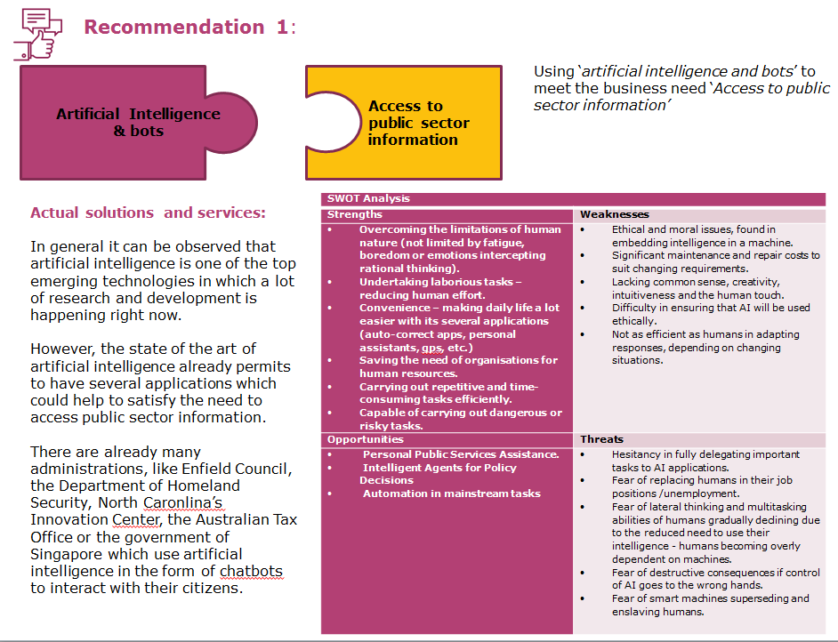 To conclude, SONNETS highlighted the gaps between the identified societal and public sector needs and the identified technological opportunities by using the multi-criteria assessment tool ‘Weighted-Bit Assessment Table (WBAT)’ to create the ‘to-do list’ with all necessary activities to implement the ICTs successfully. Based on these results, SONNETS has produced a Roadmap that puts forward 23 research and innovation directions that should be followed in order to reach the anticipated vision of reshaping and reforming the public sector into a technology leader and a key player in tackling societal challenges. These recommendations can be classified into 3 types of briefs: policy brief to inform policy makers about the necessary research needs to transform the public sector in an efficient and citizen-friendly service of the future; research brief to inform researchers about the actual technological and socio-economic research needs of the end user and technology brief to inform representatives of the public sector about new emerging ICT technologies and how these could improve the efficiency, simplify the processes and services of their day-to-day work and also help to transform the public sector to be more open and citizen-friendly.