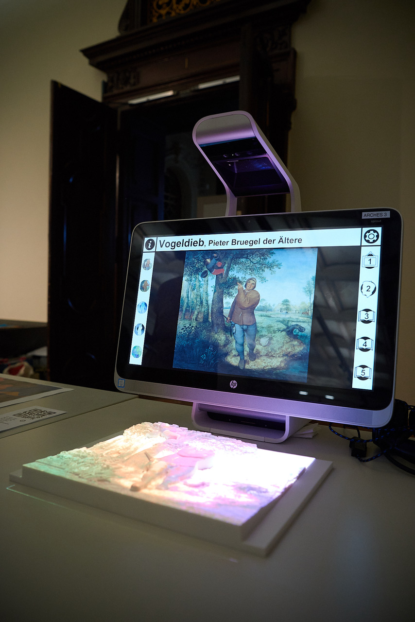 The proposed improvements to the so-called Interactive Audio Guide lead to the development of a kiosk-like installation which is now a fully-accessible multimedia guide for works of art, connecting digitalized museum resources, our tactile reliefs and further information and background stories about the respective work of art.