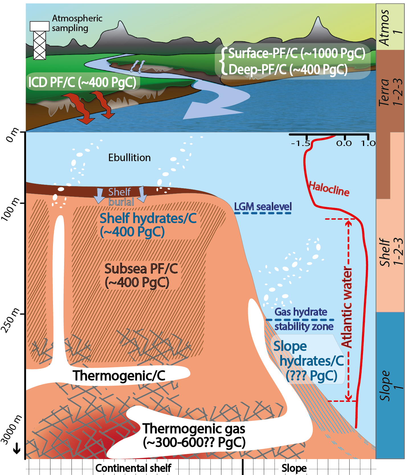 To address the overall objective, to enable decreasing uncertainties in our understanding of Arctic thawing permafrost and its effects, the work is broadly structured into four core domains: Terrestrial Cryosphere Carbon ("Terra"), Shelf/Subsea Cryosphere Carbon ("Shelf"), Slope Hydrate Cryosphere Carbon ("Slope"), and Atmospheric constraints on CH4 sources ("Atmos").