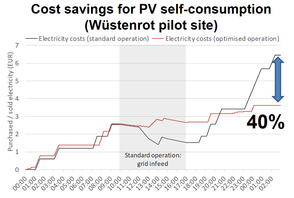 • MPC based forecast and optimization of heat pump operation has proven to be very useful to increase own consumption from PV systems and to react on flexible electricity prices leading to an increase of self-consumption of residential dwellings by up to 40%.