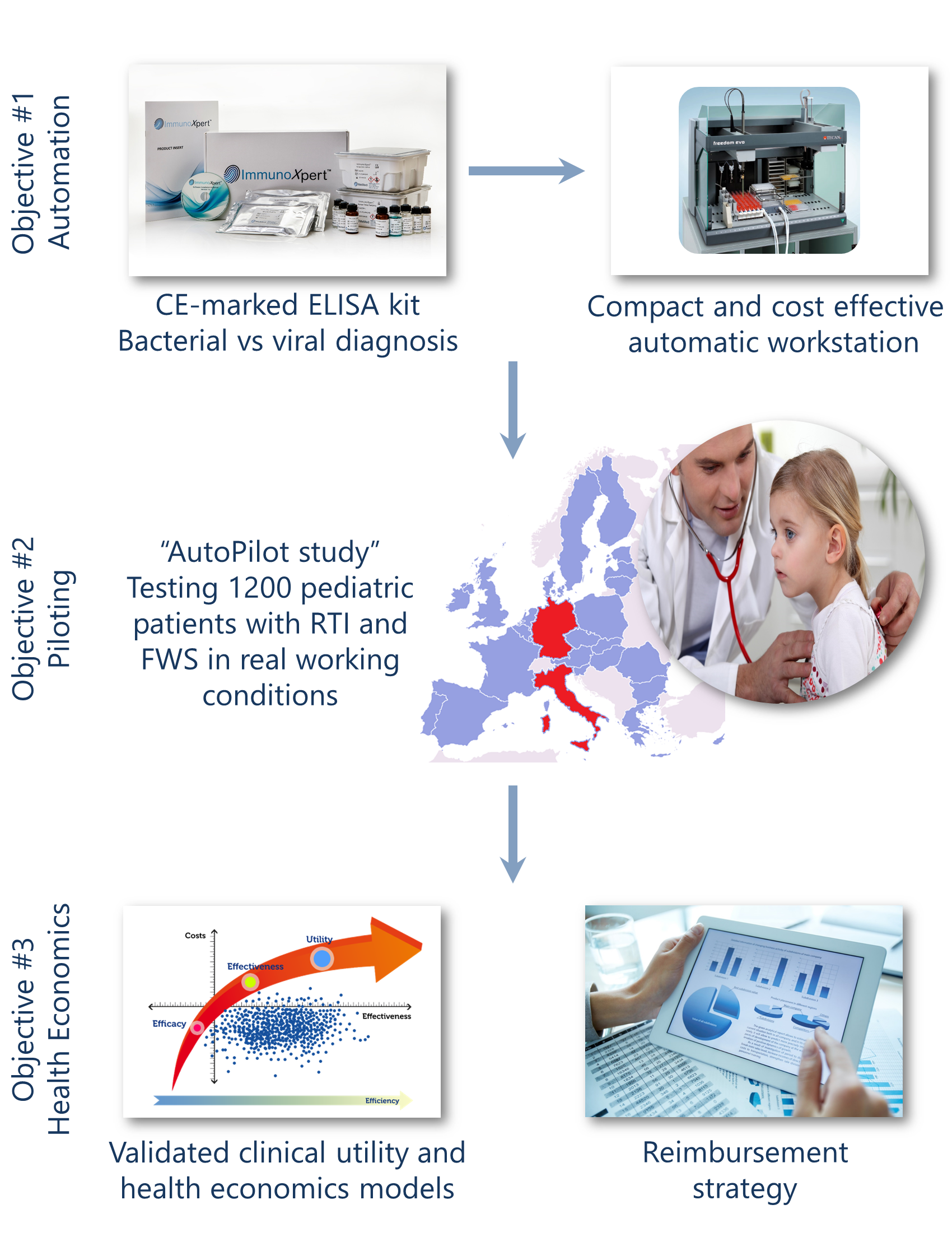 2) Piloting - We successfully completed recruitment of 1140 pediatric patients presenting with respiratory tract infection (RTI) or fever without source (FWS) at the emergency department (ED) and pediatric departments; 558 in Italy (49%) and 582 in Germany (51%). ImmunoXpert™ protein levels were measured in serum samples using the automated Tecan workstations on site for each of the 1,008 eligible patients. Reference standard labels were assigned based on unanimous expert panel labels for each of the 1,008 eligible patients. The sensitivity and specificity attained was greater than 90% based on a 2x2 performance analysis. In addition, to evaluate the potential clinical utility of the new test, a set of questionnaires were collected during the study that surveyed the physician’s clinical suspicion during the patient management course. The agreement (% agreement) and concordance (kappa) between the initial label given by the physician after examining a patient and the unanimous reference standard was calculated and compared to the same statistics for ImmunoXpert™ and the unanimous reference standard. ImmunoXpert™ was found to outperform the clinician’s initial suspicion.