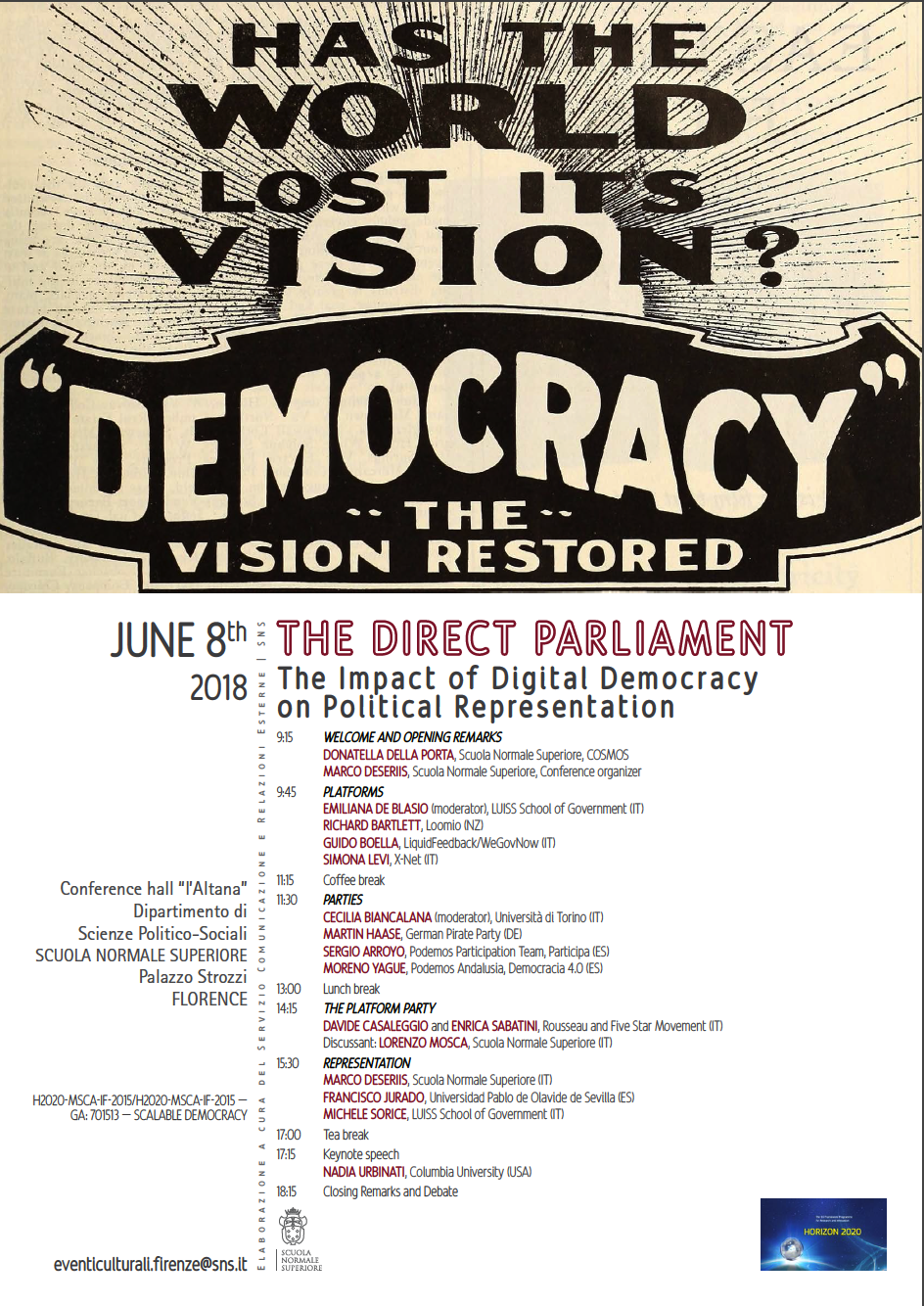 The research fieldwork begun with a series of in-depth interviews with software developers, which were published in the online magazine Open Democracy. These interviews showed not only how different decision-making software embed different conceptions of democracy, but also how the adoption of each software set in motion distinctive political processes. At the same time, interviews conducted with party activists both in Podemos and 5SM revealed a deep disconnection between the deliberative processes oriented towards consensus that drive activism at a local level and the decision-making protocols of the online participation platforms Participa Podemos and Rousseau, which foreground the voting moment as expression of their members' "sovereign will." In a paper that won the Best Paper Award at the Jedem Conference of eDemocracy and Open Government of 2017 I argued that Rousseau engenders a form of "direct parliamentarianism." While the platform allows ordinary citizens to contribute directly to the legislative activity, it also separates deliberative capacity from decisional power, leaving the former almost exclusively in the hands of elected representatives.