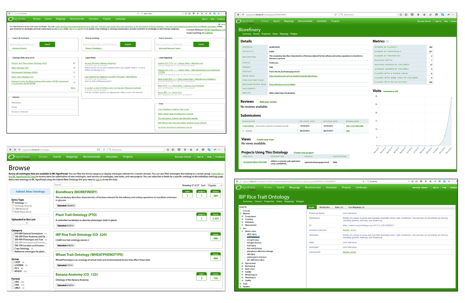 In addition, we are also abstracting and generalizing our results to agronomy by offering an ontology repository for agronomical ontologies called AgroPortal. The AgroPortal project, is a community effort started by the Montpellier scientific community (LIRMM, IRD, CIRAD, INRA, Bioversity International) to build an ontology repository for agronomy and related domains (food, plant sciences and biodiversity). Our goal is to encourage the adoption of metadata and semantics to facilitate open science. By enabling straightforward use of ontologies, we expect data managers and researchers to focus on their tasks, without requiring them to deal with the complex engineering work needed for ontology management.