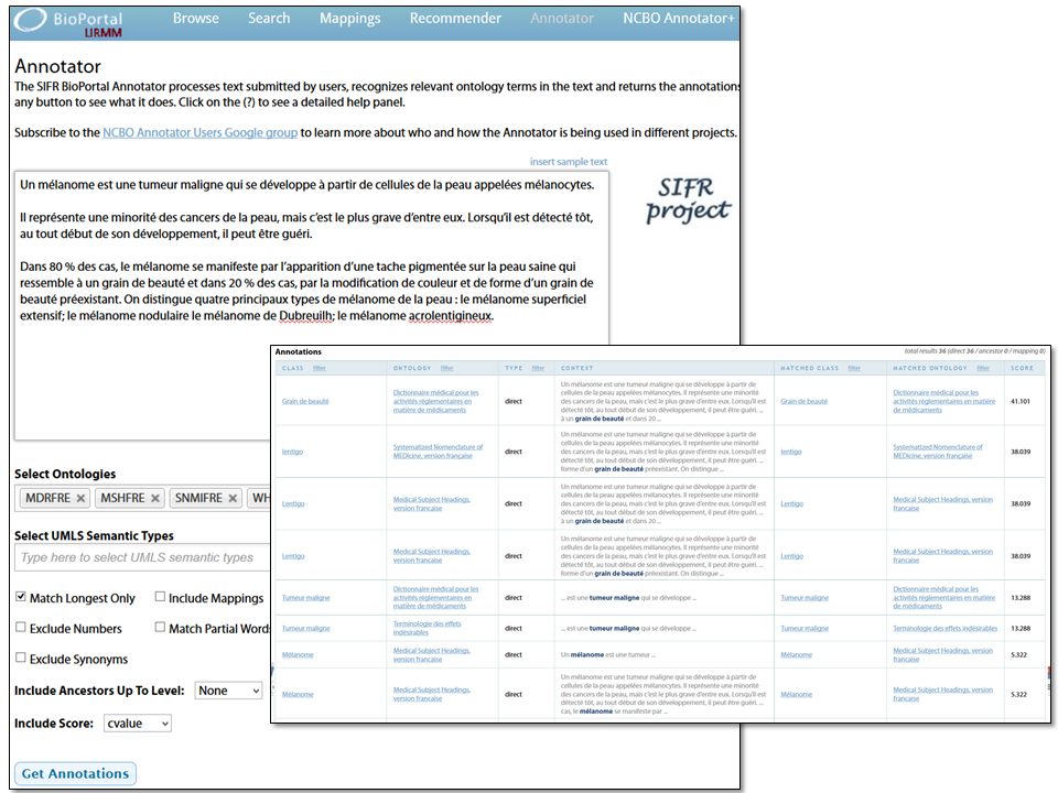 Within SIFR, we build an ontology-based indexing workflow (i.e. SIFR Annotator) similar to what exists for English resources but specialized for other EU languages, starting with French. This service is available within a portal of ~30 French biomedical ontologies/terminologies which reuses the NCBO BioPortal technology, developed at Stanford University. The SIFR BioPortal has been released in June 2015 (http://bioportal.lirmm.fr(s’ouvre dans une nouvelle fenêtre)) and actively used and improved since then. Recently, the SIFR Annotator has been enriched to process clinical data and contextualize the annotations (negation, temporality, experiencer). We offer now, both for English and French a unique open ontology-based annotation service that both recognize ontology concepts and contextualize them allowing non-natural-language-processing experts to both annotate and contextualize medical conditions in clinical notes.