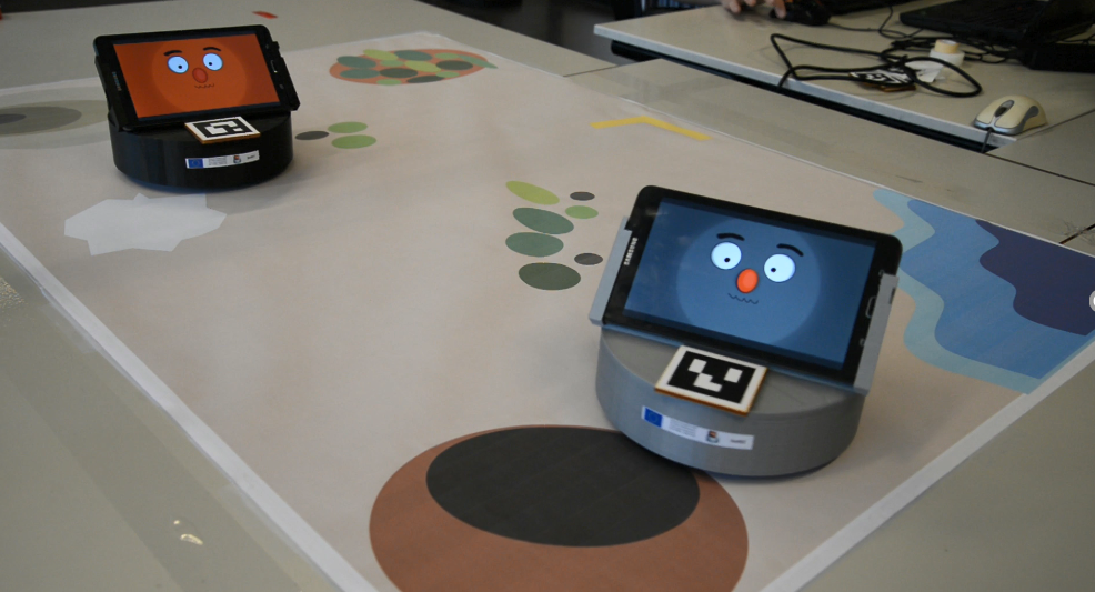 With these general objectives in mind, there are both technical and research issues/problems to be addressed. On the one hand, technical aspects such as building an IT system that enables children-robot interaction to enable them to create stories in play. The system attempts to bring an affordable and expandable implementation, which uses cheap available robotic bases, 3D printed cases, cheap tablets and commodity webcams for controlling the robots. In this way, the project opens opportunities to be used not only in a research context but also in schools or even at home with a limited budget.