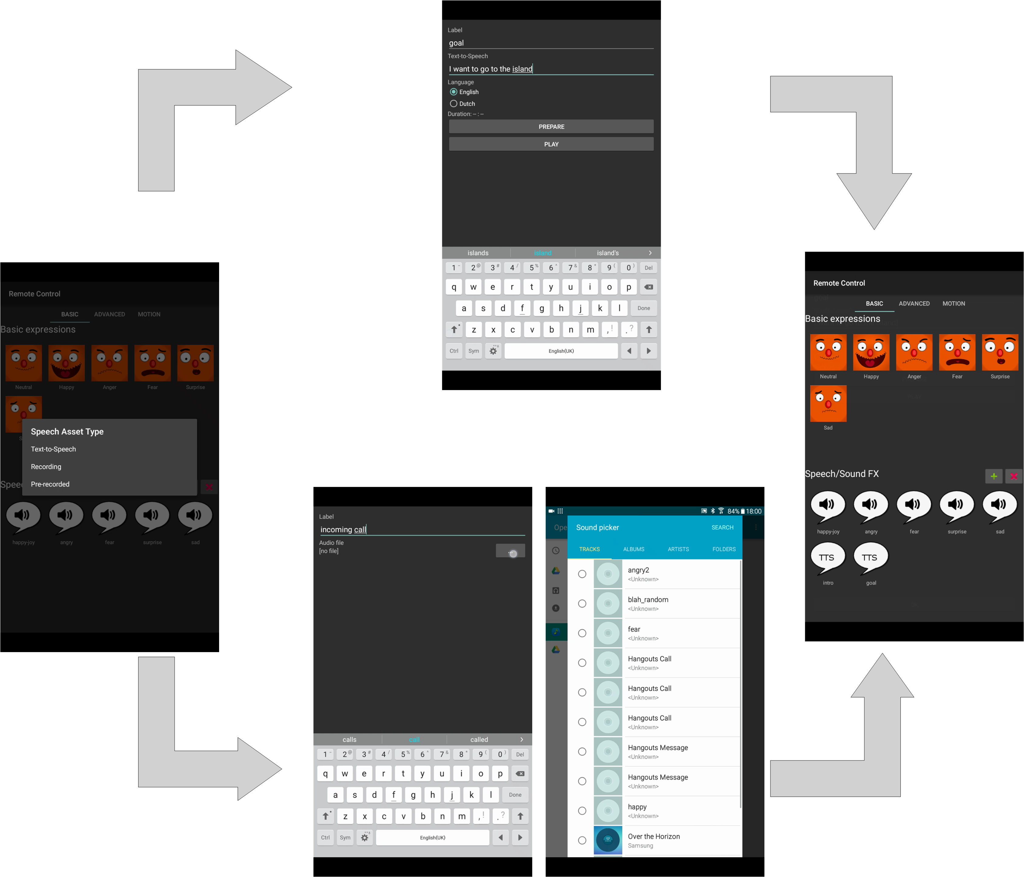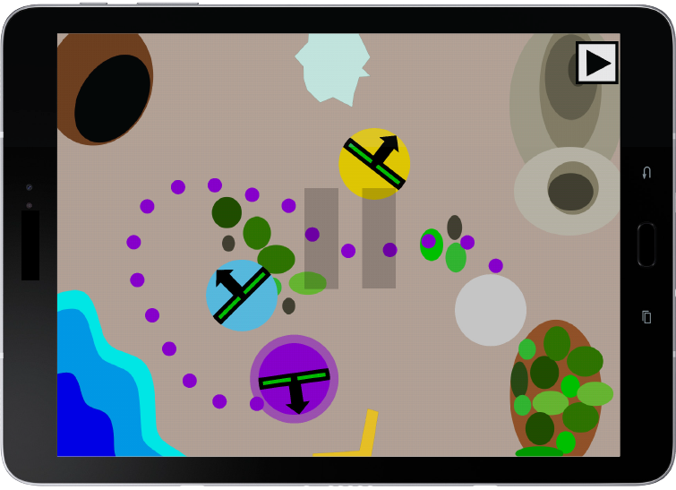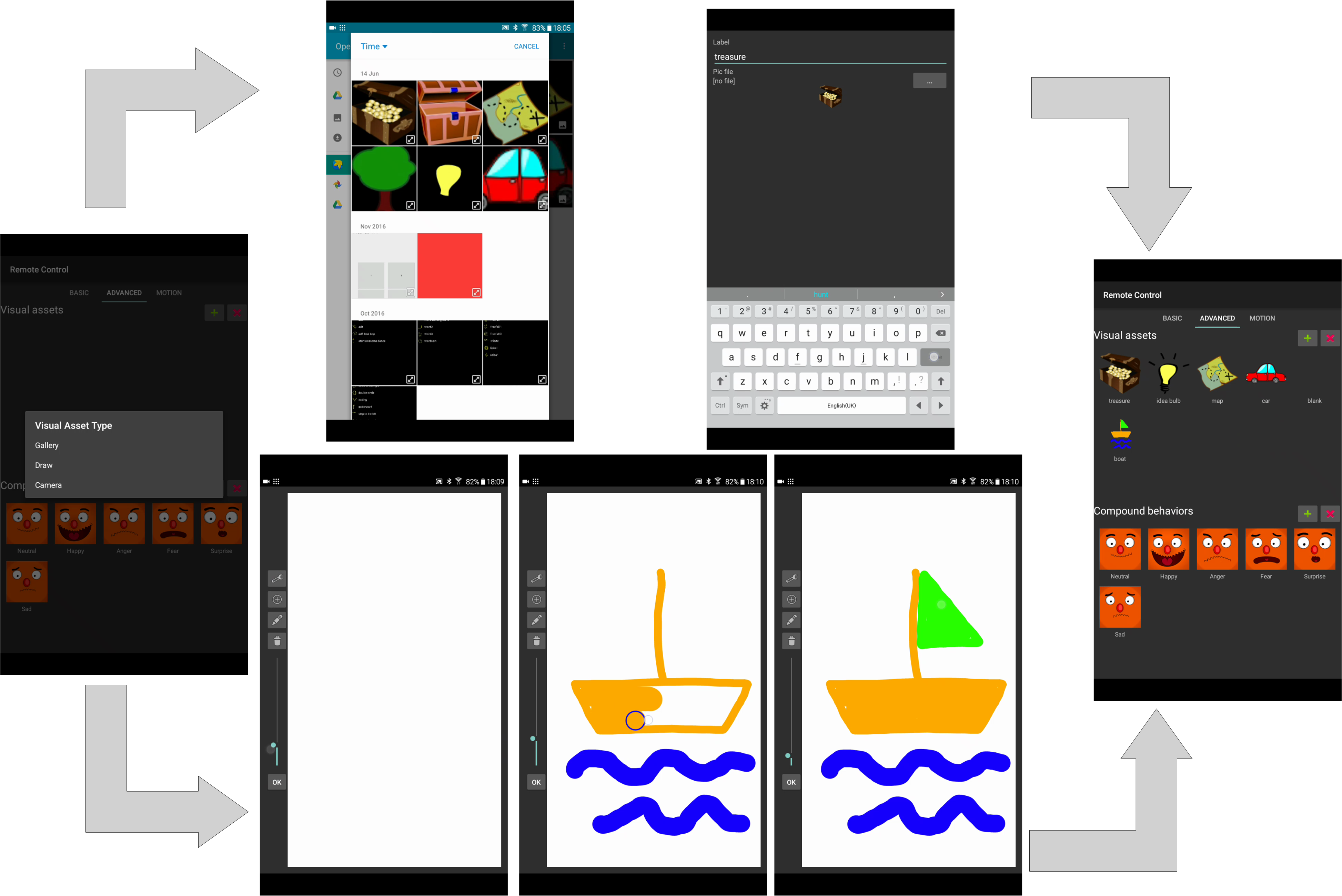 A variable number of surfacebots can be dynamically added in a play activity. There a number of editors to create user assets that can be included in activities. These support the inclusion of Text-to-Speech, recorded audio, pictures and drawings based on images from the internet or drawn on the tablet itself.