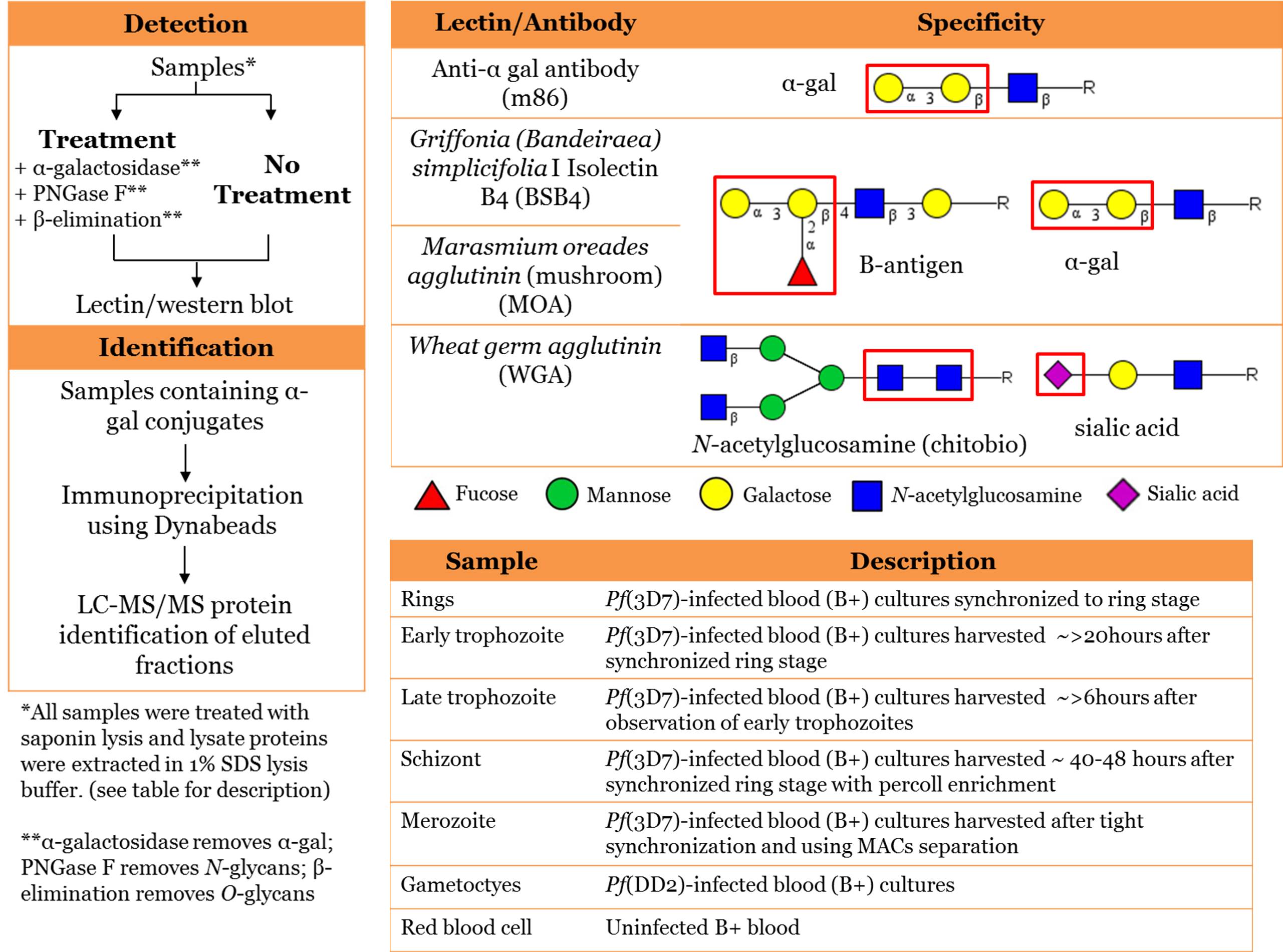 In order to study the glycans in the extracellular sporozoites and merozoites, it is crucial that they are of high purity, free from mosquito and human rbc debris respectively. The collection and purification of Pb sporozoites from infected mosquitoes were performed at the partner organization during the 6-month period. After dissecting hundreds of infected mosquitoes, we successfully obtained over 10 million Pb sporozoites with purity greater than 97% using state-of-the-art fluorescence-activated cell sorting (FACS) flow cytometry. However, due to the minute size of sporozoites, only less than 100 μg protein could be extracted and were insufficient for protein glycosylation study. Obtaining larger quantities proved to be challenging due to variations in mosquito infection rates, which were difficult to control and took months to stabilize. The alternate source from commercially available sporozoites was isolated using methods that did not produce sporozoites of high purity for glycan analysis. Instead we acquired Pf-infected and non-Pf-infected mosquito salivary glands for further proteomics analysis. Nevertheless, we have established the parameters using FACS to sort fluorescently-labelled sporozoites as previously known method (density gradient) used to separate sporozoites from mosquito debris did not result in such high purity. As for merozoites, using existing optimized methods in our laboratory, we successfully obtained highly purified and large quantities of tightly synchronized Pf merozoites. We also isolated sufficient quantities of other blood-stage parasites including rbc-infected rings, trophozoites, schizonts and gametocytes. As these samples inevitably contained rbc debris, uninfected rbcs were also collected simultaneously as controls. Using lectins, anti-α-gal (m86) and blood stage-specific antibodies, we investigated the protein glycosylation in the extracted protein samples. The results showed specific α-gal expression patterns, which appeared to relate to their growth cycle during the blood-stage development. They were not detected in the mature parasites (merozoites, schizonts and gametocytes) but was repeatedly observed in the young parasites that exist as rings and trophozoites in the rbcs. As it was not detected in the uninfected rbcs, we concluded that the α-gal epitopes were from the parasites and may be under specific developmental regulation. We further validated the results using α-galactosidase enzyme capable of removing α-gal structure from the proteins. The type of protein glycosylation was then determined using enzymatic or chemical reactions to study the glycan-protein linkage. The results indicated that these glycans were not likely to be O-linked or GPI-anchor protein glycosylation, while signals seemed to be slightly reduced with N-linked deglycosylation. In the late phase of the project, isolation of the glycan-bound protein(s) from the extracted protein mixture was performed using immunoprecipitation and m86 antibody and analysed using LC-MS/MS analysis. In addition to blood-stage parasites, comparative analysis of proteins obtained from Pf-infected and non-infected salivary glands of Anopheles mosquito was performed. Preliminary analysis identified a total of 1053 non-redundant proteins with 193 and 3 of those uniquely present in the infected and non-infected samples, respectively. Given the reported significance of α-gal in malaria, we are currently working with collaborators to gain further insights into the data obtained.