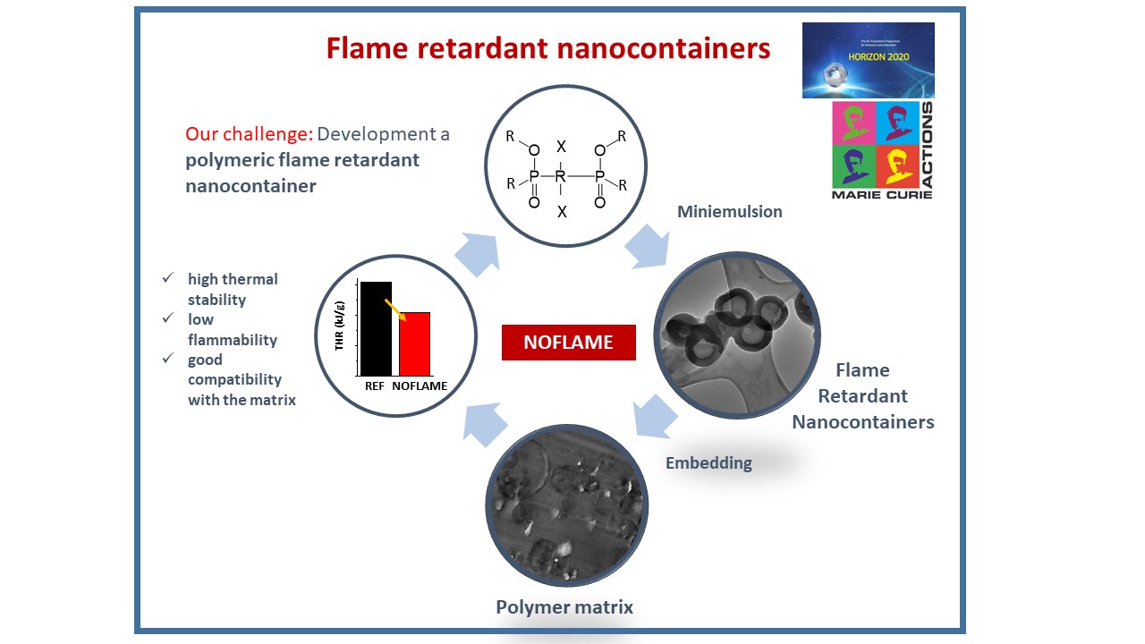 From a scientific perspective, the main activities within NOFLAME were: 1) the synthesis of nanocontainers and the encapsulation of organic and inorganic flame retardant compounds, 2) the introduction of the nanocontainers in a polymer matrix and 3) the evaluation of their influence on the mechanical and flame retardant properties of the final material. This project was only possible combining the expertise of the host MPIP Institute (Max Planck Institute for Polymer Research) and the partner BAM Institute (Bundesanstalt für Materialforschung und –prüfung).