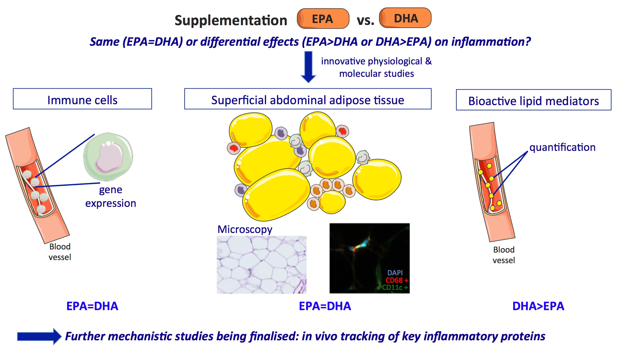Chronic inflammation, which describes a state of low but sustained blood levels of proteins that play a role in the response to injury and acute disease, is now indisputably recognized as a key risk factor for heart disease. Obesity is a frequent cause of chronic inflammation, leading to a state of metabolic disorders such as increased blood lipids and hypertension, a state frequently referred to as metabolic syndrome (MetS). The increasing obesity rates worldwide have been paralleled by increases in the prevalence of MetS and associated heart disease risk over the last decades, with unprecedented social and economic impacts on the global health care burden. It therefore becomes of highest priority to investigate strategies to prevent or decrease chronic inflammation among at-risk patients. Nutritional strategies play a major role, especially those based on omega 3 fatty acid dietary supplements. Indeed, omega 3 fatty acids, notably eicosapentaenoic acid (EPA, 20:5n-3) and docosahexaenoic acid (DHA, 22:6n-3), have raised tremendous interest notably for their blood lipid lowering effect and purported anti-inflammatory potential. However, data from rigorously conducted clinical studies supporting anti-inflammatory effects of omega 3 fatty acids are surprisingly lacking. Moreover, almost all studies so far have used a mix of omega 3 fatty acids, notably DHA and EPA together. Therefore, it remains unclear if DHA and EPA have similar or different effects on chronic inflammation, and if so, by which mechanisms. Recent studies suggest that fat accumulation plays a direct role in promoting whole body chronic inflammation. The laboratory of Dr Lamarche has shown previously that DHA is more potent than EPA in reducing some of the blood markers of inflammation in adults at risk of heart disease. In this context, the overarching objective of the present project was to compare and further understand the anti-inflammatory effects of EPA and DHA in men and women at risk of heart disease through innovative physiological and molecular studies. The main results achieved so far suggest that (1) the genes that influence inflammation processes in immune cells do not contribute to the distinct anti-inflammatory effects of high doses of EPA vs. DHA on plasma markers of inflammation, (2) superficial abdominal adipose tissue does not appear to play a role in explaining the difference between EPA and DHA in modulating chronic inflammation, and (3) the stronger anti-inflammatory effects of DHA compared with EPA may be due, in part, to changes in specific bioactive lipid mediators derived from DHA and EPA. No difference between men and women was observed in response to EPA and DHA supplementation regarding the above-mentioned results. Further novel mechanistic studies based on the in vivo tracking of key inflammatory proteins such as C-reactive protein and serum amyloid A are being finalised and will undoubtedly be breakthrough in explaining the anti-inflammatory effects of DHA and EPA.