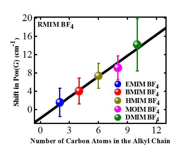 Impact of the nanostructure of the ionic liquids on graphene is also mostly governed by the type of anion present in ionic liquids. To some extent the cation also plays a mild role on electronic structure of graphene. Imidazolium-based ionic liquids with Tf2N anion could not alter the properties of graphene. However, non-aromatic pyrrolidinium cations having Tf2N anion show mild influence on graphene properties, specifically the longer alkyl chains present on the cation. The observed results can be rationalized by considering charge delocalization, which is more prominent in the case of the imidazolium cation than the pyrrolidinium. In contrast to these ionic liquids, imidazolium-based ionic liquids with BF4 anion have strong influence on the graphene electronic structure. The impact of BF4 ionic liquids gradually increases with increasing alkyl chain length on the imidazolium cation. In other words, significant influence has been observed in the case of longer alkyl chains present on the imidazolium cation.