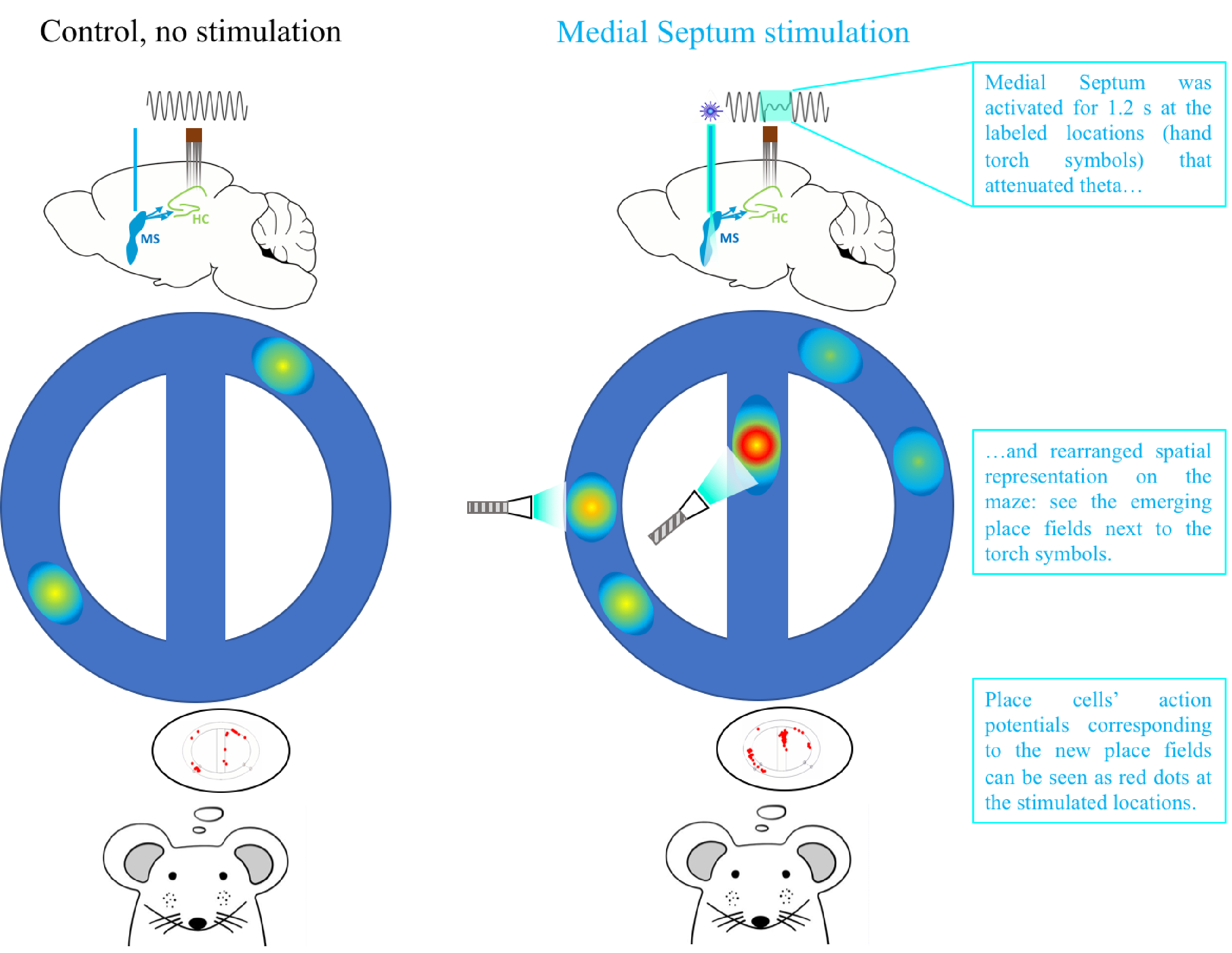 Regarding the experimental part of the Outgoing Phase, we implemented a location-contingent closed-loop optogenetic stimulation strategy: the medial septum was light-activated when the animal entered a pre-defined location monitored by distance sensors.