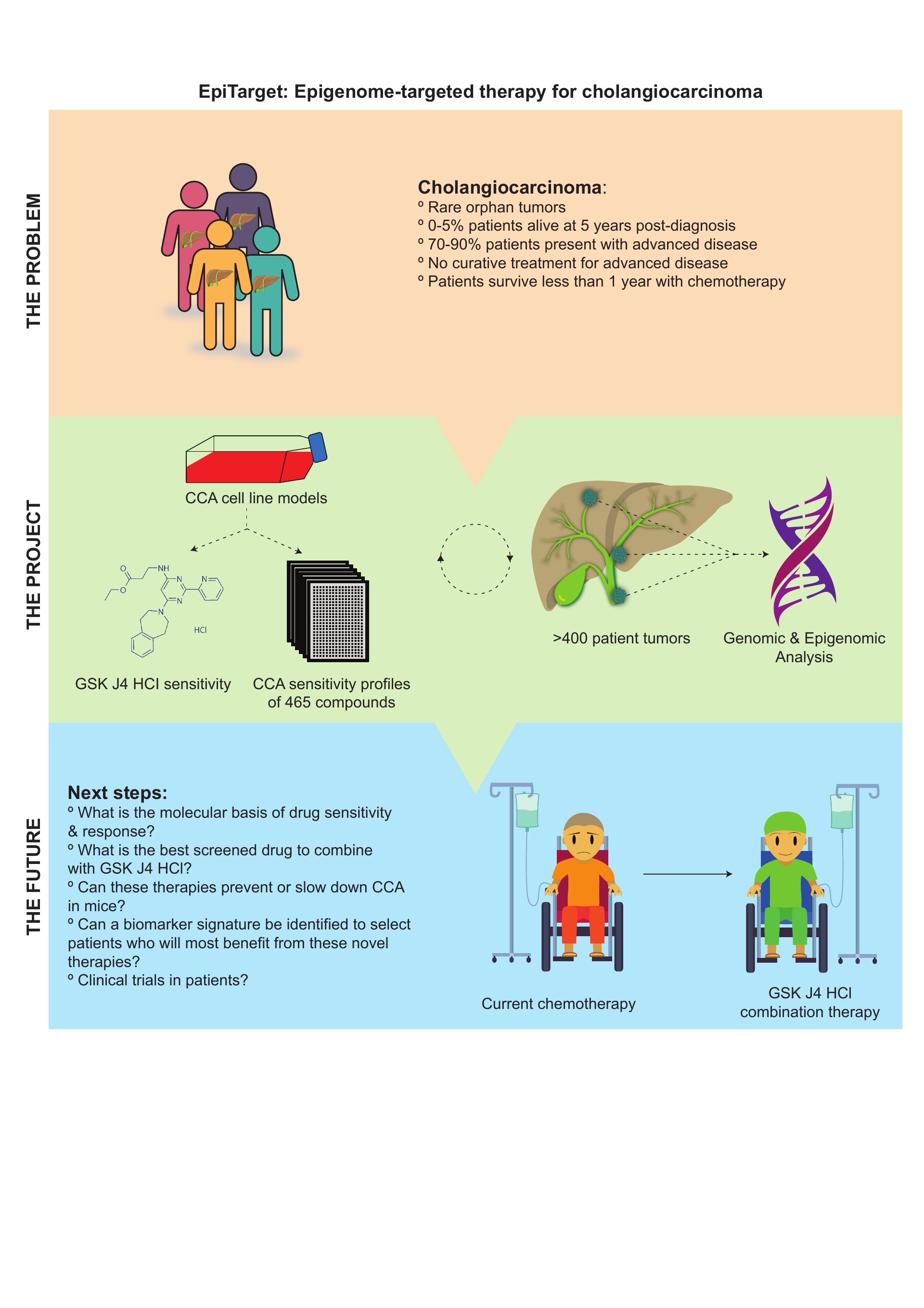 Initially, the interpretation of sequencing studies in CCA was somewhat bleak as they painted a picture of biliary tumours as highly heterogeneous malignancies with low-to-moderate mutation frequencies in ‘classic’ cancer-associated genes and identified significant proportions of patients with no mutations at all in such genes. However, these studies universally highlighted recurrent mutations in epigenetic regulators which, given their normal function in epigenome homeostasis, implicates extensive epigenome dysregulation in CCA. Epigenome-targeted therapy affords several advantages over mutation-based approaches, including the innate reversibility of epigenetic marks and the fundamental importance of epigenetic plasticity and remodelling to chemoresistance and metastasis. Accordingly, the objectives of this EpiTarget fellowship were to decipher the genomic and epigenomic landscapes of patient tumours and synergistically evaluate the therapeutic potential of clinically-tolerable epigenetic drugs in CCA.