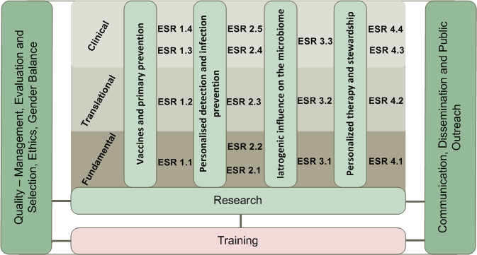 Pronkjewail ESRs have performed several relevant projects within the area of infectious diseases, especially involving vulnerable patients, and at each step of medical management. They have investigated new diagnosis tools for viral and bacterial infections, especially next generation sequencing and fluorescent probes, with a focus on the hospital environment and on potential and actual outbreaks. Concerning treatment, several projects have offered recommendations concerning drug delivery, optimised dosing, personalised medicine, antimicrobial stewardships. ESRs have performed diverse research, from fundamental to clinical, from laboratory based, to data science, to clinical trials.