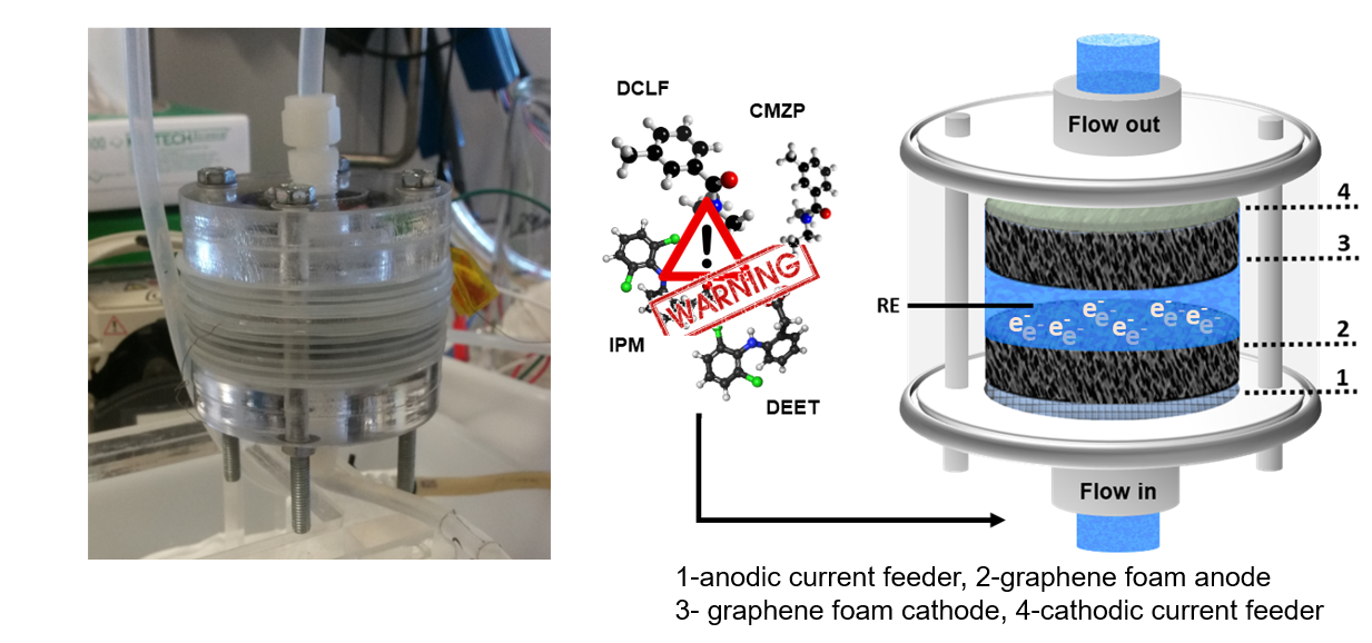 1) Demonstrated capability of anodically and cathodically polarized graphene sponge electrodes to degrade a range of persistent organic contaminants such as pesticides, antibiotics, iodinated contrast agents and others and even PFAS, categorized as “forever chemicals” due to their extreme persistency in advanced water/wastewater treatment. This, coupled with the fact that the system does not lead to the formation of toxic chlorinated byproducts, opens up the possibility of treating highly complex and brackish PFAS-laden streams such as landfill leachate, reverse osmosis concentrates and others. This outcome represents a major breakthrough in the field.
