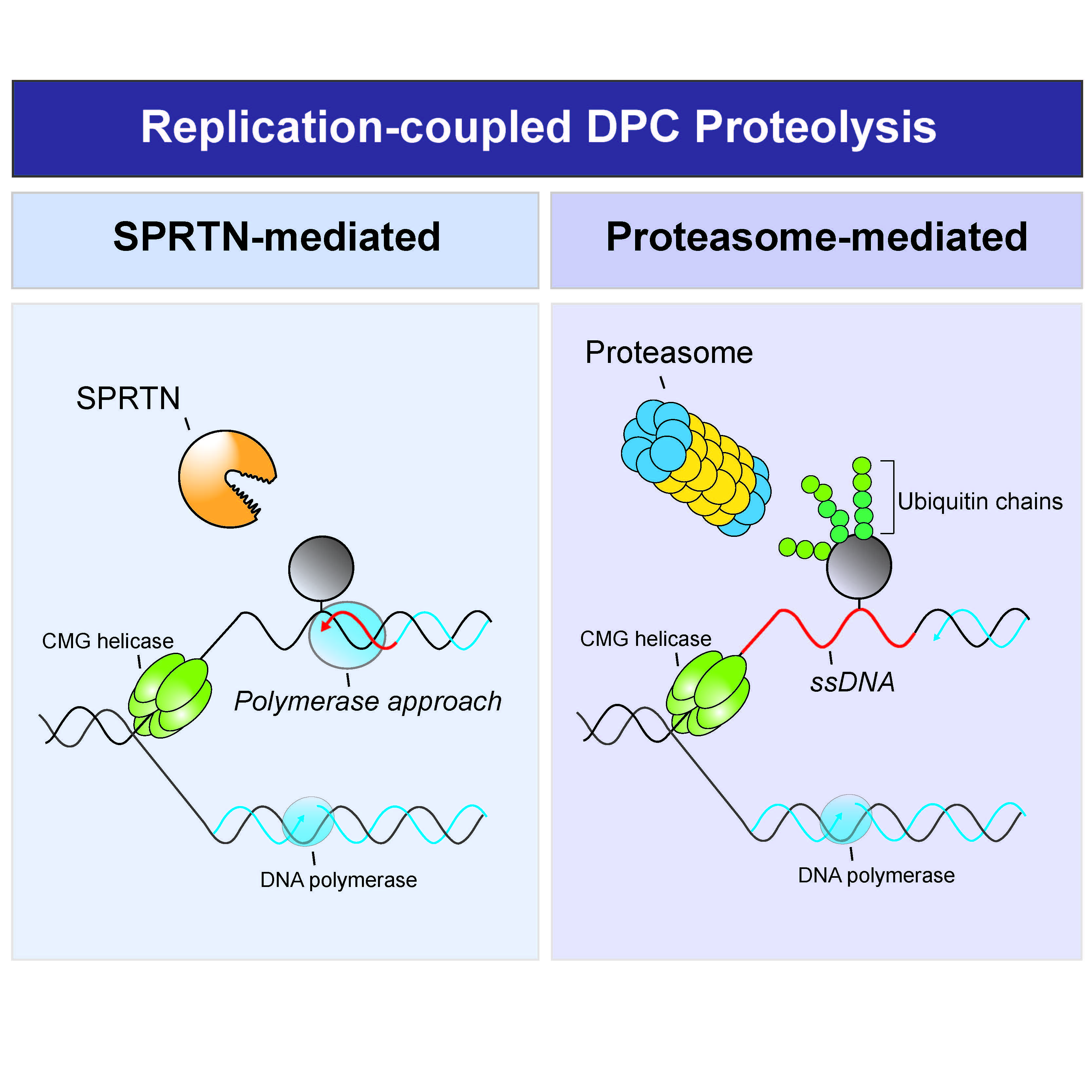Particularly, we have delineated the molecular function of SPRTN in DPC repair and provided the molecular events that activate and target the protease to DNA-protein crosslinks. Contrary to what was anticipated, SPRTN-mediated DPC degradation does not require DPC ubiquitylation. Instead the protease is activated when a nascent strand is extended to the lesion which appears to be the essential event that targets the protease behind replication forks (to maintain the replisome away from protease activity).