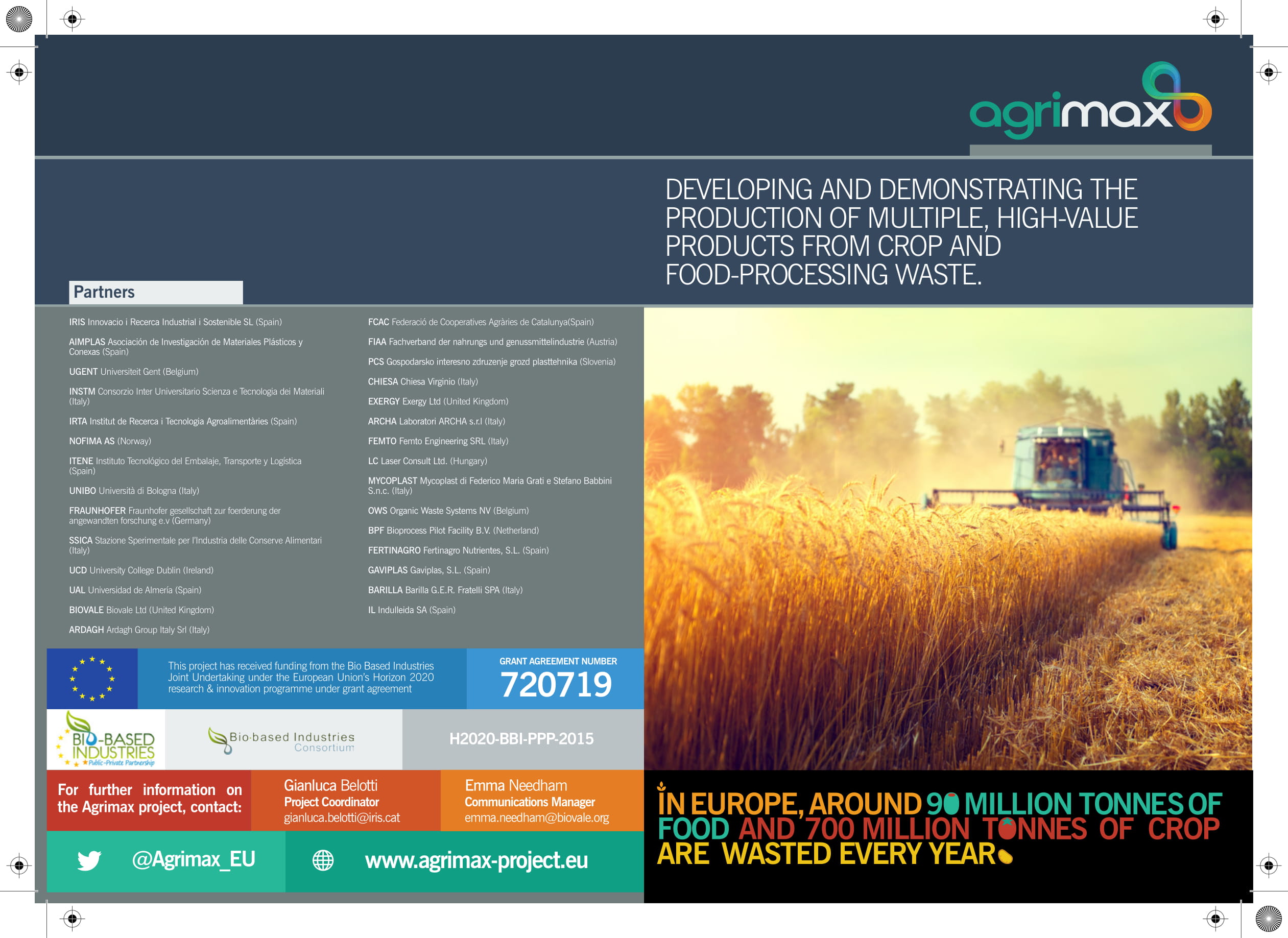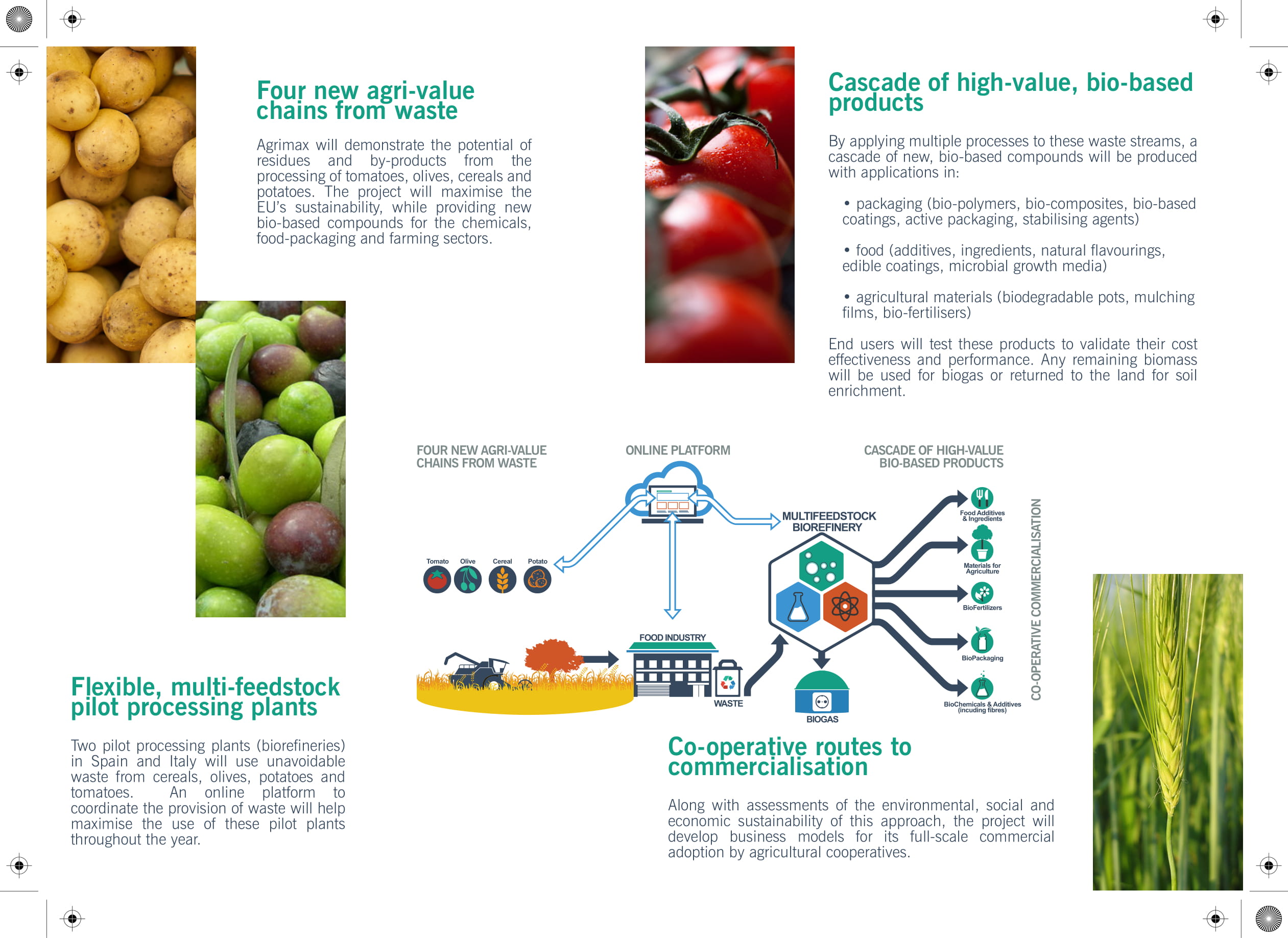 Agrimax brings several benefits to the primary production including food loss reduction, natural resources preservation, fossil feedstock replacement, by-product valorisation and environmental impact reduction. Such outcomes have been proven at demonstration scale by the development of two multi-feedstock pilot biorefineries. These convert agricultural and food processing wastes (AFPW) into products that have been validated in operational environment. The two pilot biorefineries have been built in Italy and Spain upgrading and extending the functionalities of already available facilities at the hosting site. These are now used to manufacture the products that in the second half of the project have been validated in their final final applications. The performances of the final products have been validated and the overall environmental impact of the entire value chain has been successfully evaluated according to the LCA standard.