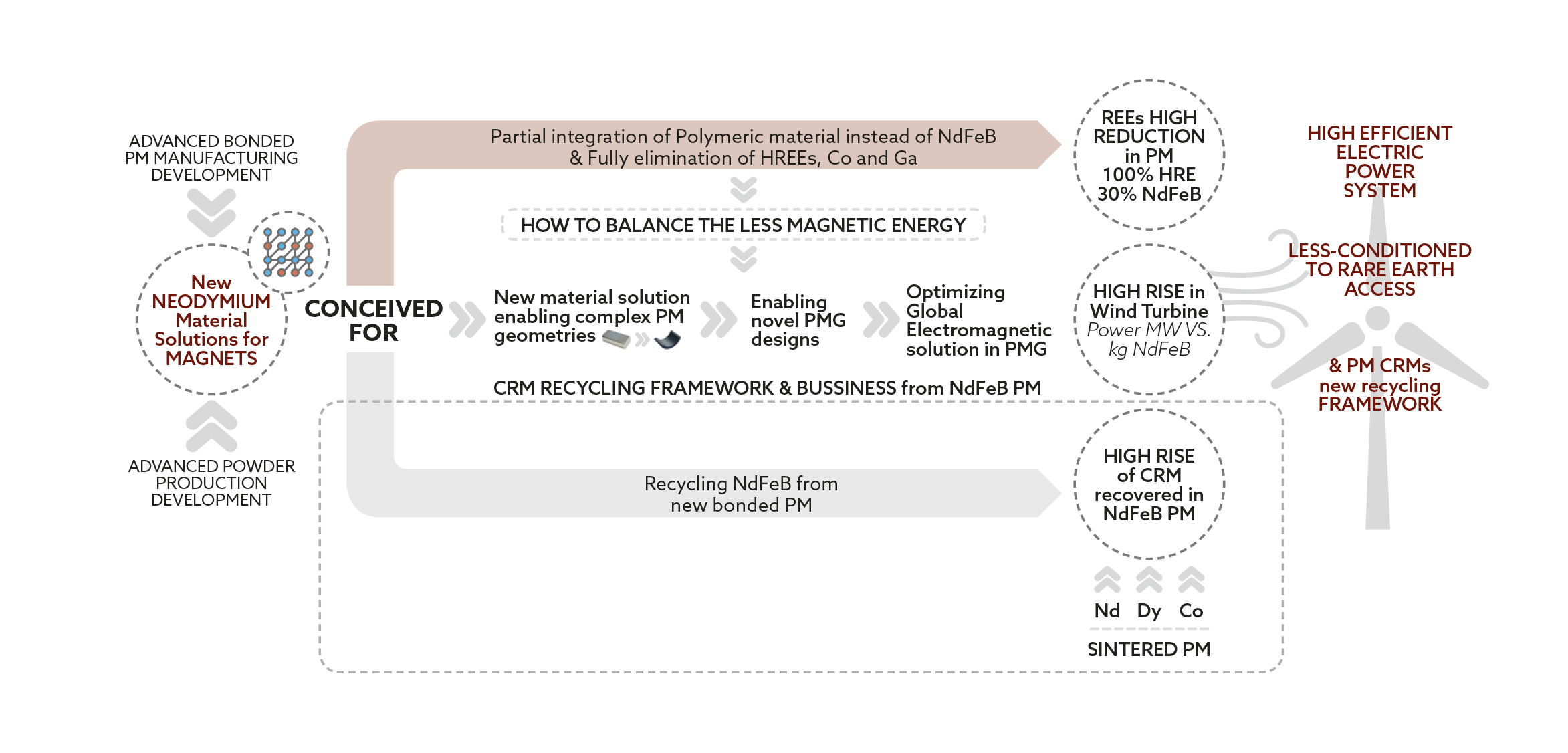NEOHIRE main objective is to reduce the use of Rare Earth Elements (REE), and Cobalt and Gallium in the permanent magnets used in Wind Turbine Generators (WTG).