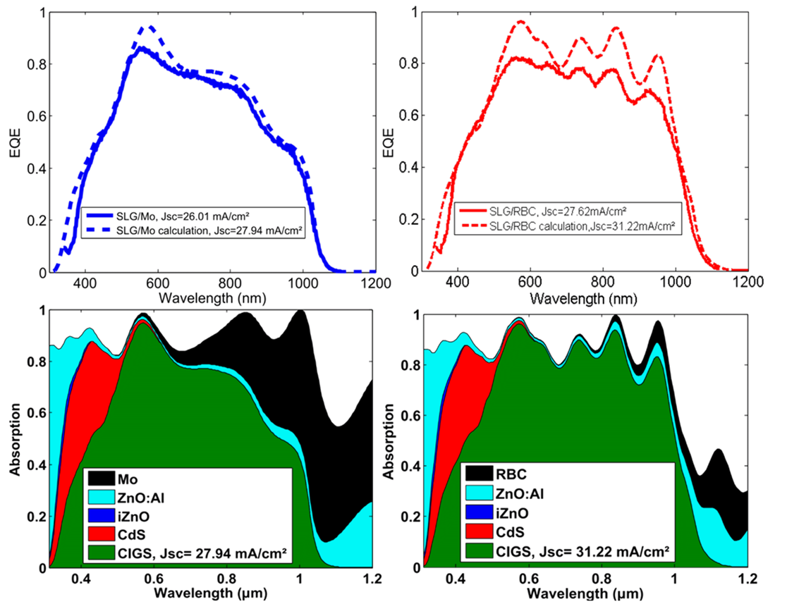 Furthermore, a fully reflecting back contact (RBC) has been developed and patented and demonstrated within the project. About 90 % of the current density for a solar cell with 500 nm thick CIGS was obtained as compared to a solar cell with full CIGS thickness.