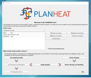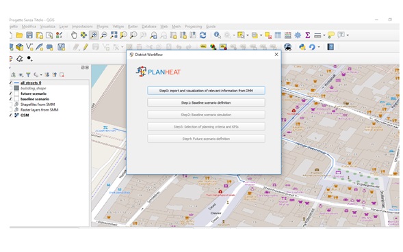 The PLANHEAT Open Source tool is a Q-GIS plug-in, whose structure has been agreed in year 1 by the whole consortium (also thanks to the indications received by EU cities via a survey/participatory approach), and it is composed by three modules: mapping, planning and simulation as foreseen by the GA. In order to be operated by as many cities as possible in EU (in accordance to the different level of availability of data), two parallel approaches have been designed: a bottom-up one (DISTRICT) and a top-down one (CITY).