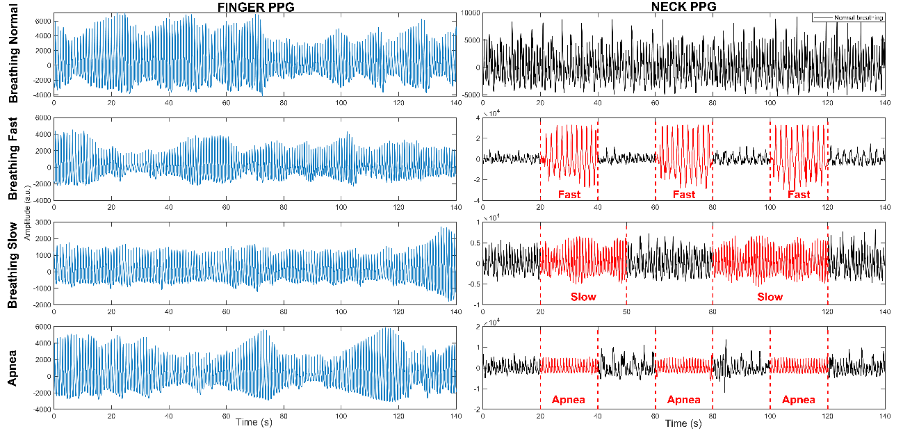 2- Investigation of all scientific and engineering challenges surrounding extraction of oxygen saturation from the neck. A highlight of this work so far has been the characterization for the first time in literature of all the artifacts affecting the PPG signal (ie the physiological signal from where oxygen saturation is obtained) when this is sensed in the neck.