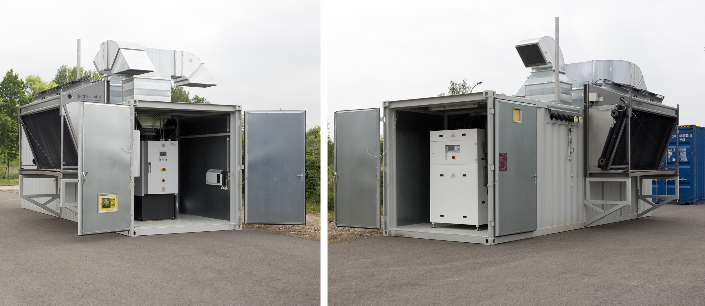 The up-scaling of the absorption chiller from 25 to 100 kW (AKM 25 to 100) refrigeration capacity has successfully been completed. In this context, a new space-saving high-performance heat exchanger was developed together with a partner company. The portfolio for application-oriented refrigeration is completed through the adaptation development of a cascade for low cold and an emergency refrigeration unit. Demonstration plants with different configurations of the peripheral components have been designed as container modules. The flexibility and mobility of these plug & play plants enable a quick response to specific customer demands. Alternatively components of the new refrigeration technology can also be directly integrated into existing systems of the customer.