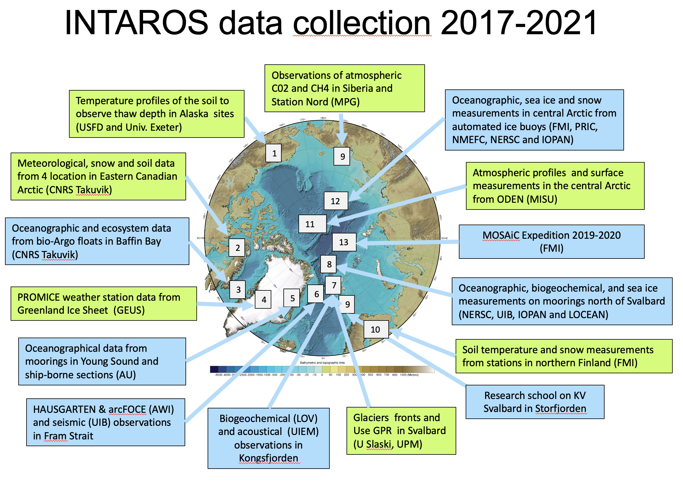 INTAROS has contributed with large amount of multi disciplinary in situ observations, especially from the under sampled ice-covered ocean regions in the Nansen Basin and Baffin Bay. One important goal was to fill gaps in existing observing systems regarding biological data, ocean acidification, biogeochemical parameters, snow water equivalents, albedo, and microplastic in selected key regions of the Arctic. The experiences with new sensors and platforms provide a basis for further development, and testing in new projects.