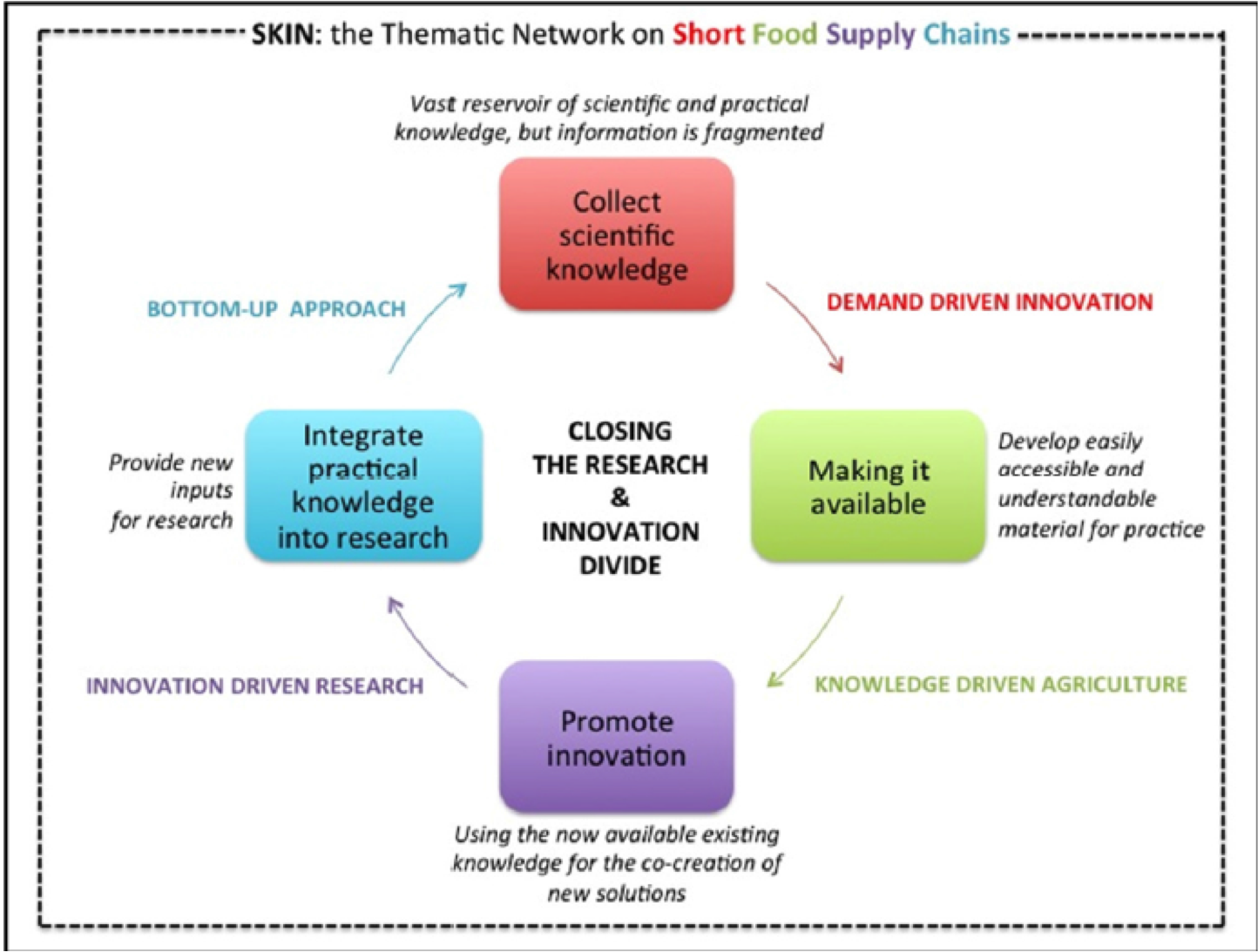 The overall SKIN objective was to tackle such fragmentation in the access to different practice models, systematise information and data available, empower the potential innovators in the agrifood chains and create a EU community, serving as a permanent platform for knowledge exchange, transnational cooperation, promotion of innovation and generation of input to policy maker. To this aim, a virtual community of practice ""Keep-it-Short"" has been created and now implemented."