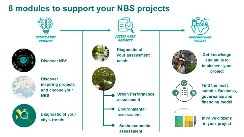 The approach taken in Nature4Cities was to build a self-learning platform [Nature4Cities Platform] for NBS, containing technical advice, methods and tools to empower urban planning decision-making for NBS. With this goal in mind, the Nature4Cities project provides eight complementary and interactive modules to engage urban stakeholders in a collective learning process about the renaturing of cities; it develops and circulates an extensive knowledge base on NBS, new business, financial and governance models for NBS projects; and it provides tools for impact assessment, review and follow-up of NBS projects.