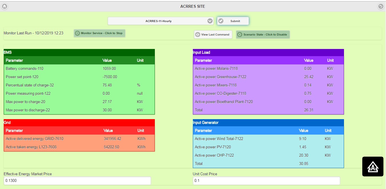 In ACRRES test site, the smart grid testing facilities (Fig.2) which include three sources of renewable energy (wind turbines, solar PVs and biogas plant) and several consumers with simulated consumption of 210 households), worked with the connected RFB under the control of original SGCS. The validation of SGCS was carried out in on-grid mode.