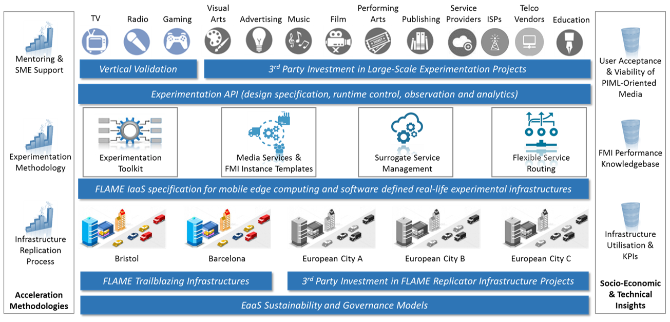 FLAME is working to extend OASIS TOSCA for spatially and temporally provisioned services along with the higher-level KPI constructs needed to allow media service providers to define performance targets. A first version of the experimentation toolkit has been implemented providing a monitoring and measurement model for time-based data integration and analysis of cross-layer information. A first version of the FLIPS platform supporting service function routing has been delivered.