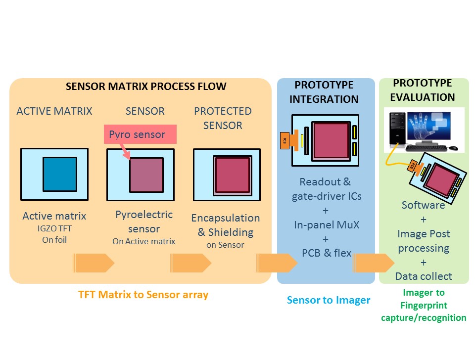 For this purpose, PYCSEL project will develop a low cost thin and large area fingerprint sensing surface enabling the personal identification via the development of a TOLAE technology, combining an organic sensor with a TFT matrix on a plastic foil. Based on the fact that personal recognition requires high resolution (500 dpi) and large (1 up to 4 fingers) sensors, the project focuses on the design, development and integration of a printed pyroelectric PVDF-based sensor layer on a IGZO TFT active matrix on foil and connected to an electronic driver and readout board, resulting in a thin fingerprint conformable sensor with no need for any optical bulky and/or costly extra components integration. Multiple fingerprints capture will be possible with the resulting large area hybrid system whose conformability allow easy further integration and ergonomic use especially for high growth and high value portable security uses.