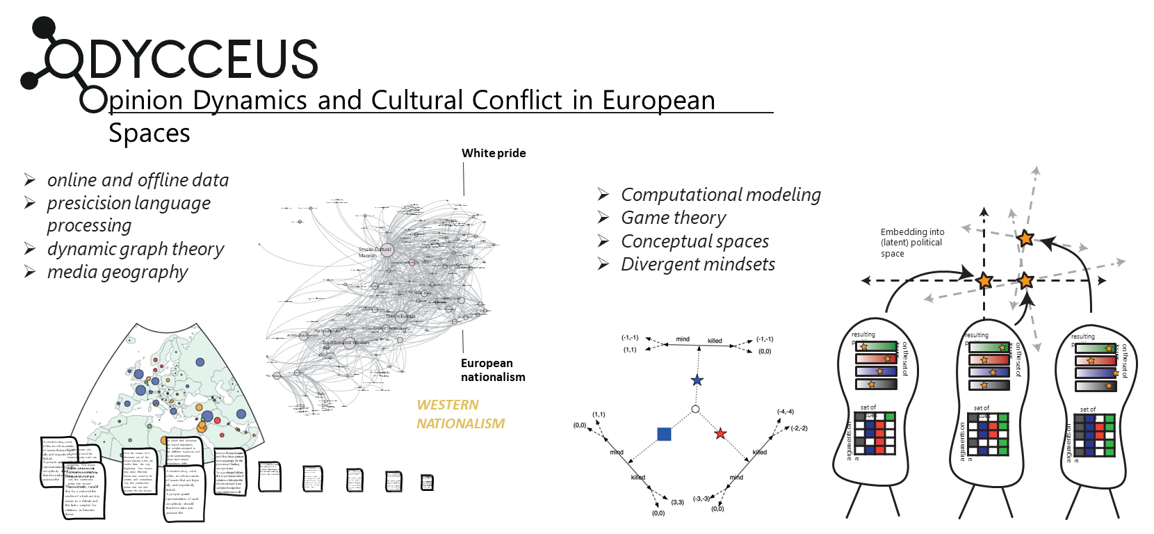 ODYCCEUS stands for Opinion Dynamics and Cultural Conflict in European Spaces. The project seeks conceptual breakthroughs in Global Systems Science, including a fine-grained representation of cultural conflicts based on conceptual spaces and sophisticated text analysis, extensions of game theory to handle games with both divergent interests and divergent mindsets, and new models of alignment and polarization dynamics. The project will also develop an open modular platform, called PENELOPE, that integrates tools for the complete pipeline, from data scraped from social media and digital sources, to visualization of the analyses and models developed by the project.