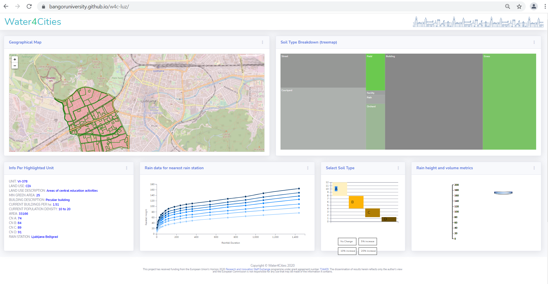 The prototype delivered for Ljubljana case study uses the Urban District Sub-Catchment (UDSC) as an urban area unit that encompasses critical properties of the urban area for modelling, monitoring and visualizing the critical variables. In this context, the Urban District Sub-Catchment (UDSC) represents in the prototype a basic (static) unit for sensor data collection, modelling of urban water runoff, modelling of (Nature-Based Solutions) NBS locations as well as the basic modelling unit for visualization. The basic parameters that are calculated and displayed by the tool are i) current/future land use; ii) rain data; iii) soil type and climate changes; and iv) rain infiltration/runoff. For each pillar, selected parameters are calculated and visualized through appropriate tools (treemap diagrams, plots etc.) to support rain water data analysis from decision makers.