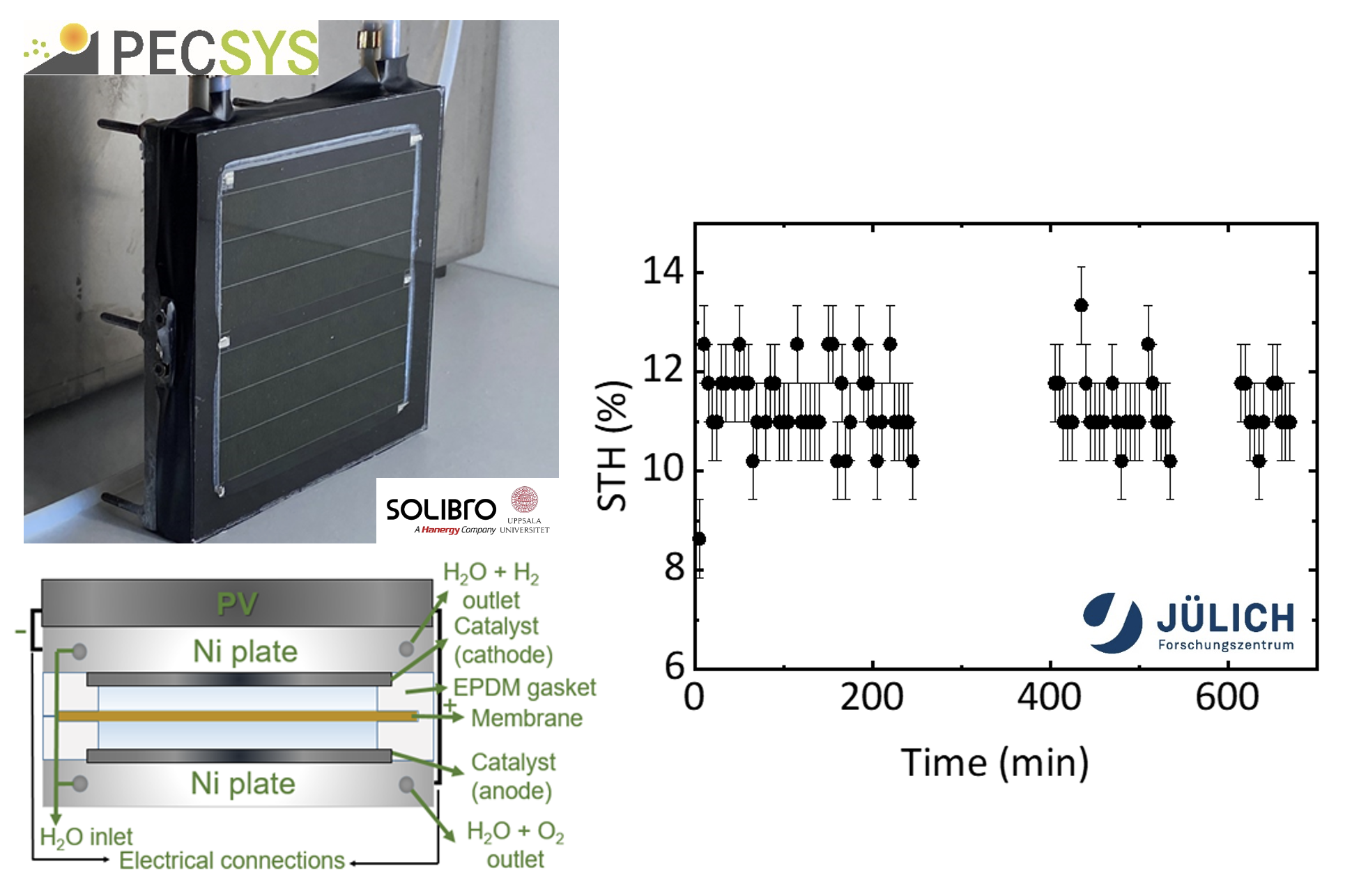 Additionally, a silicon heterojunction (SHJ) photovoltaic module was thermally integrated with an alkaline electrolyser and scaled-up from 294 cm² to 2600 cm² solar collection area at Helmholtz Zentrum Berlin (Germany). Thanks to insights from the analysis of the outdoor performance of the smaller device, the heat transfer between the PV module and the electrolyser in the larger prototype, increased leading to a 34% relative improvement in ηStH to 5.1 % at 1000 W/m². Under these conditions, the scaled-up prototype achieved an H2 generating capacity of 85 mL/min at an area specific rate of 1.56 g/h/sq.m.