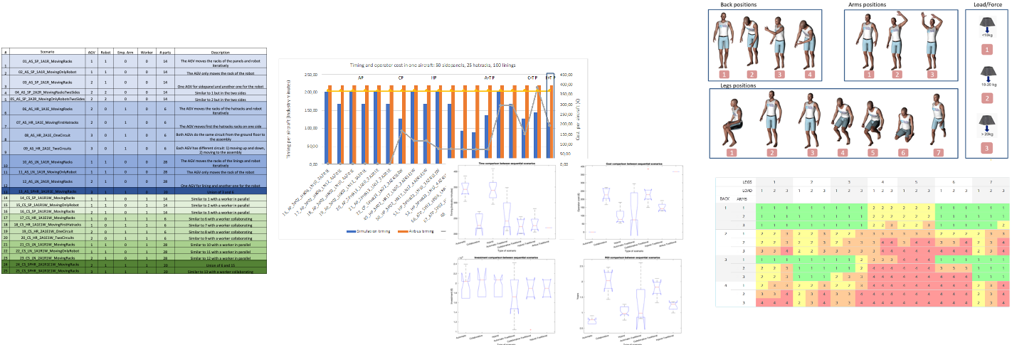 As a conclusion of the project, we have a very flexible and powerful interactive VR simulator with which it is possible to generate different alternatives of scenarios to an assembly process changing the level of automation, human-robot collaboration, number of robots, etc. After, a multivariable analysis can be done in order to evaluate the alternatives with different KPIs (Key Performance Indicators) like timing, cost, ergonomics, investments and ROI. A total of 23 basic scenarios and 81 whole aircraft scenarios have been simulated and evaluated.