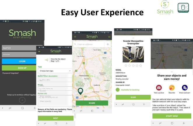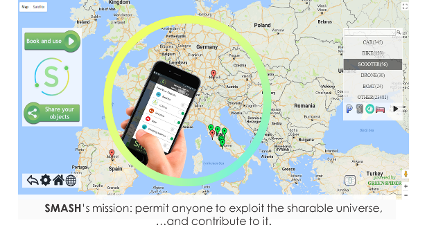 SMASH puts in contact the community of people willing to share their own resources, vehicles, and objects, for obtaining a profit, and people willing to use them.