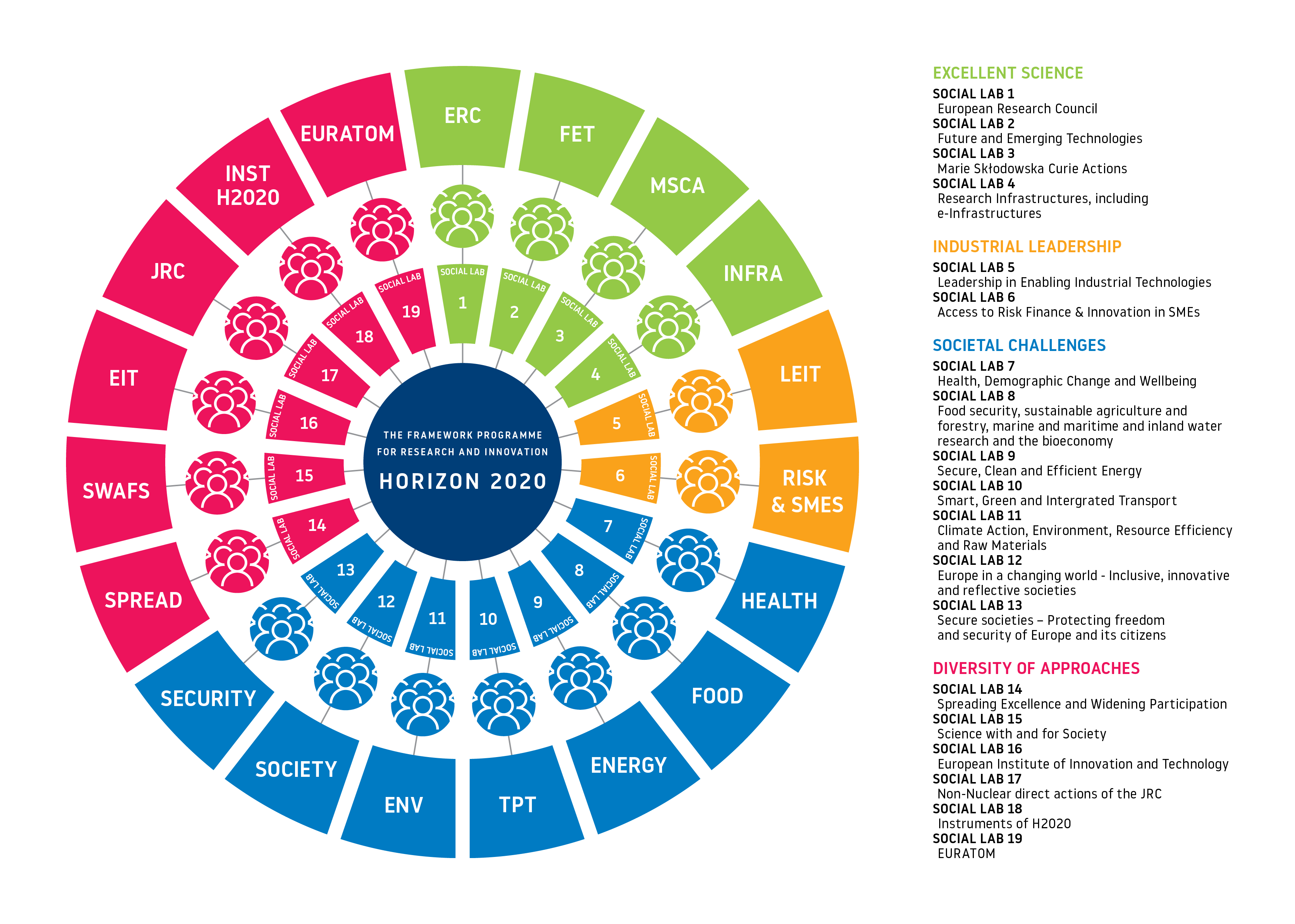 • Call together different stakeholders in R&I in 19 Social Labs for each part of Horizon 2020 to co-create social experiments that foster the uptake of RRI.
