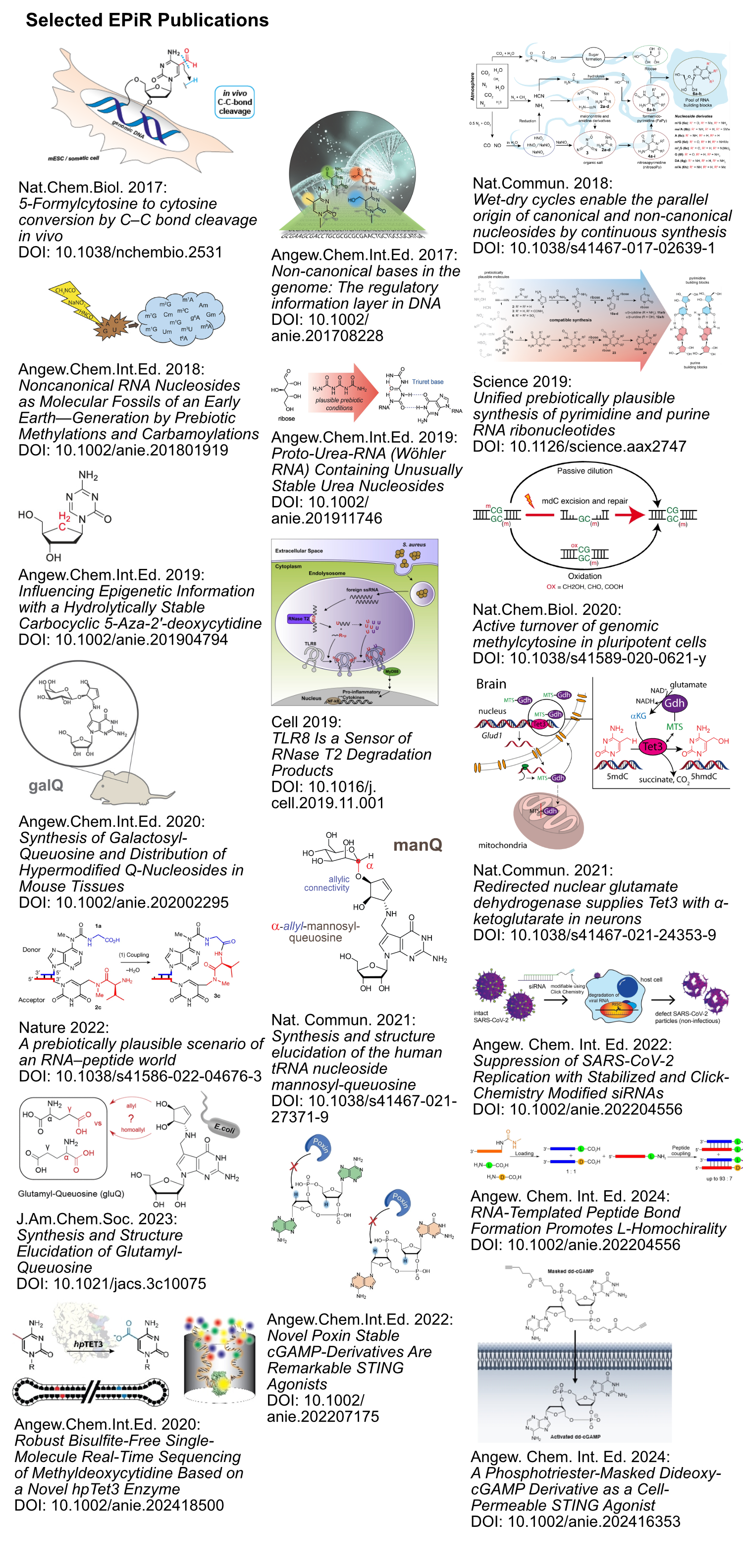Our next milestone achievement was based on our ability to incorporate highly modified nucleosides into polymers, on which we developed a prebiotically plausible scenario of an RNA-peptide world and the transmission of chirality. Those high impact publications have earned us the participation in a television documentary ("Life from Outer Space", ARTE) , highlighting important aspects of our work. We were also invited to organize the Leopoldina conference on the "Origin of Life". A further highlight of our research was the synthesis of the highly modified non-canonical nucleosides glutamyl-, galactosyl- and mannosyl queuosine, which are hyper-modified nucleobases present in the anticodon loop of tRNA. Here we could show by total synthesis and direct comparison of the synthetic material with material isolated from various organs that the chemical structure of mannosyl queuosine reported in the literature was wrong. Our expertise in nucleic acids synthesis and analysis allowed us to successfully enter the world of immunology, to which we contributed novel STING agonists based on the second messenger cGAMP and the elucidation of the role of RNase T2 in innate immunity.