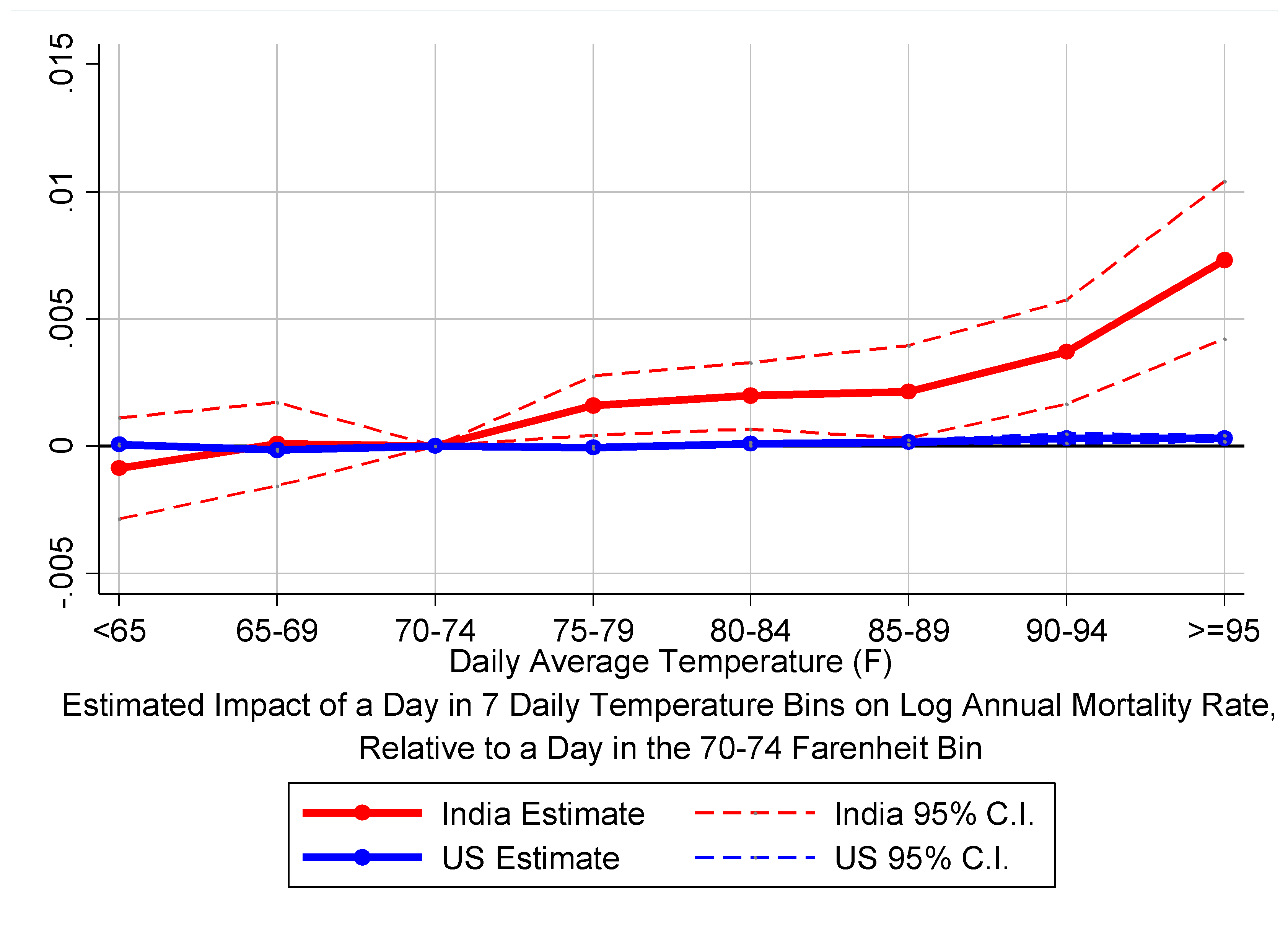 Notes: The red (India) and blue (US) lines report 7 coefficient estimates (circle markers), representing the effect of a single day in each of the corresponding 7 temperature bins, relative to the effect of a day in the 70-74 F bin, on annual all-age log mortality rate. Dashed lines represent the 95% confidence interval of the estimates. The figure is taken from Burgess et al. (2018).