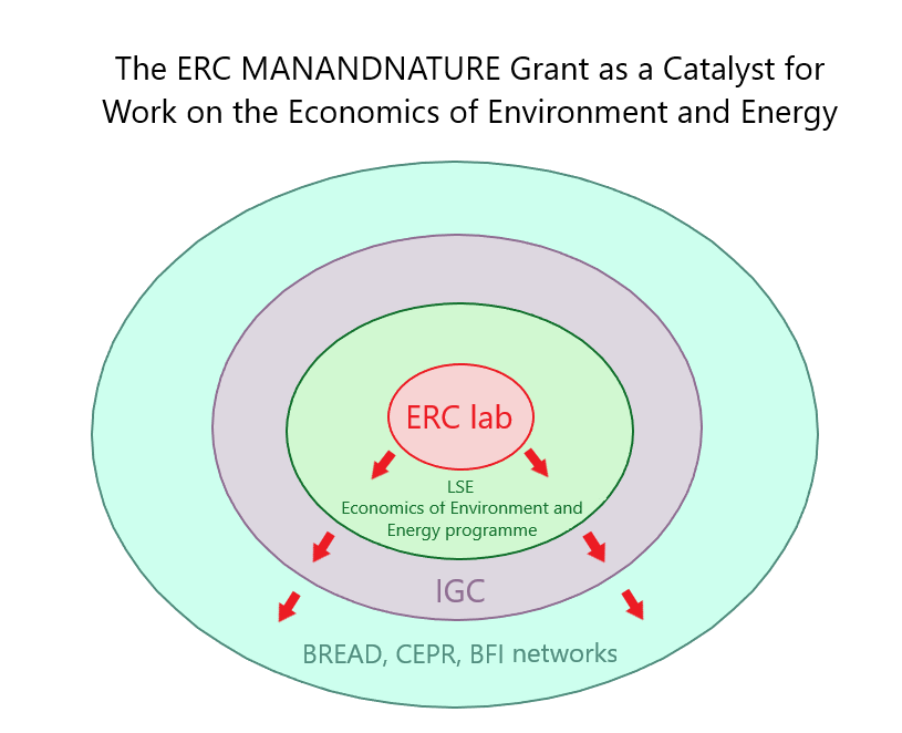 Concerning the objective of building a community of scholars working on the economics of environment and energy in the developing world, we have used the ERC grant to build a dedicated Research Lab within the Department of Economics at the LSE. This contains the PI Robin Burgess, the research manager and predoctoral research assistants involved in the ERC projects. It has been a catalyst in terms of generating work in this key area by drawing in faculty, both from across the Department of Economics but also from other universities across the globe. The setting up of the Lab using the ERC grant has been a catalyst for establishing the LSE Economics of Environment and Energy (EEE) Programme within the host institution STICERD and which is directed by the PI Robin Burgess. The ERC grant has therefore made this type of research a focal point within Europe’s top economics department.