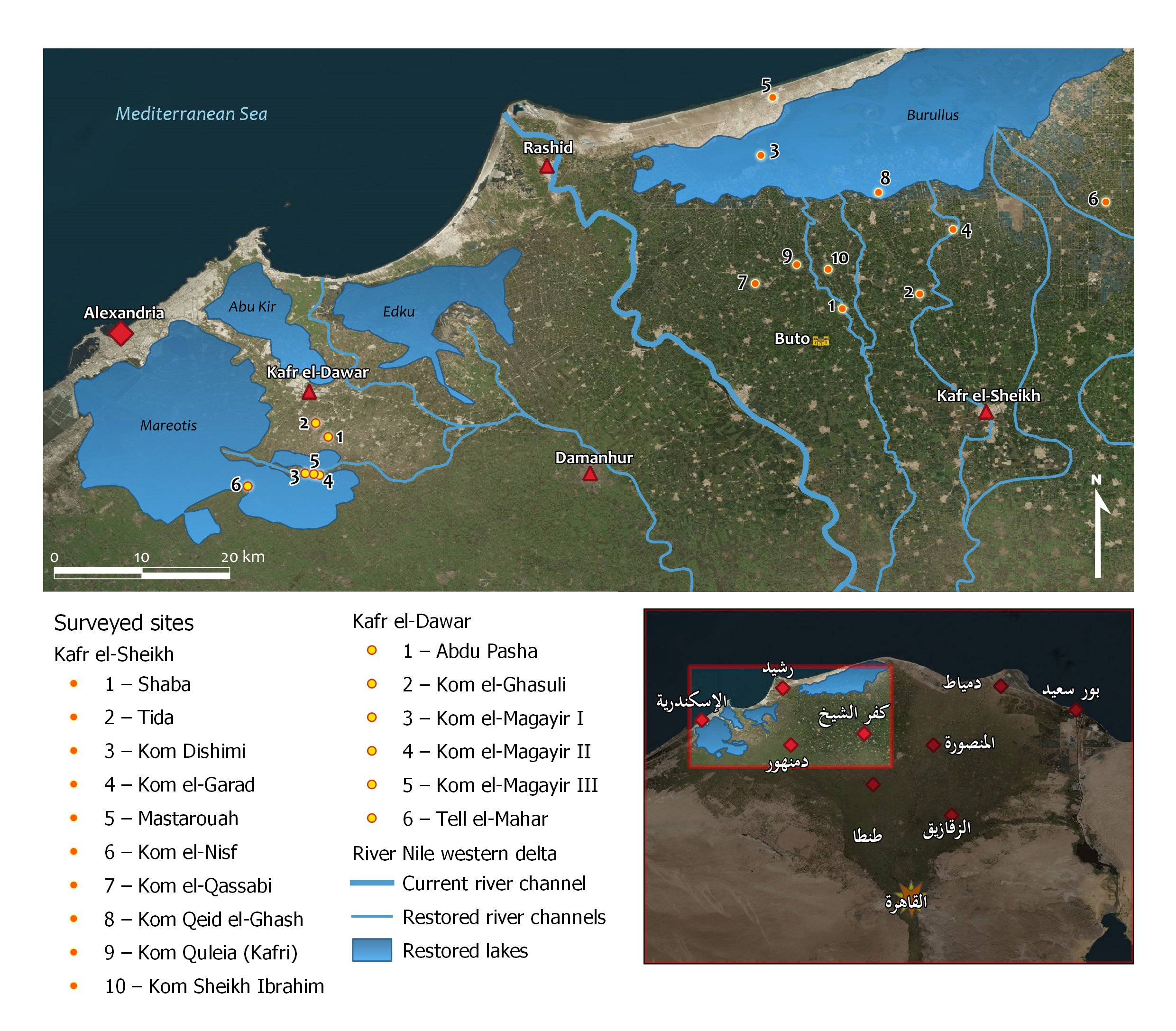 The second part of the project was focused on landscape archaeology in order to identify the environment where the “regionally specific sacerdotal” officials lived. This part included two complementary strands of research: a) Collation of archaeological and excavation reports and study of available maps related to the Western Delta (Survey of Egypt, Corona and Landsat satellite data); and b) selection and survey of four sites at Kafr el-Dawar province (Western Delta, Egypt): Kom el-Ghasuli, Abdu Pasha, Kom el-Magayir I, II, III, Kom el-Mahar (https://www.ees.ac.uk/kafr-el-dawar(si apre in una nuova finestra)).