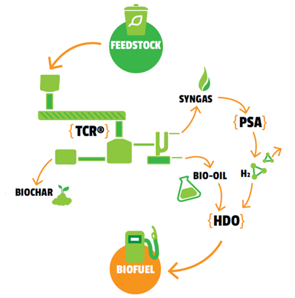 TO-SYN-FUEL demonstrates a new integrated process combining Thermo-Catalytic Reforming (TCR®), with hydrogen separation through pressure swing adsorption (PSA), and hydro-deoxygenation (HDO), to produce a fully equivalent gasoline and diesel substitute (compliant with EN228 and EN590 European Standards) and green hydrogen for use in transport. The primary ambition of this project was to demonstrate and validate the technical and economic viability of the integrated TCR®/PSA/HDO technology approaches, together with their environmental and social sustainability, as well as the cost-competitiveness, at near commercial scale through the construction of a demonstrator that will also serve as an exemplar to facilitate rapid commercial uptake.