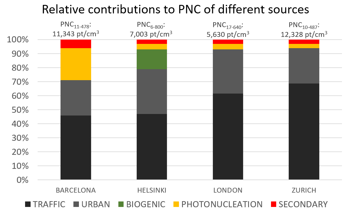 - To identify and quantify the sources of UFP in the cities of London (UK), Barcelona (Spain), Zurich (Switzerland) and Helsinki (Finland) based on long time-series of size-segregated UFP (particle number size distributions) and other pollutants.