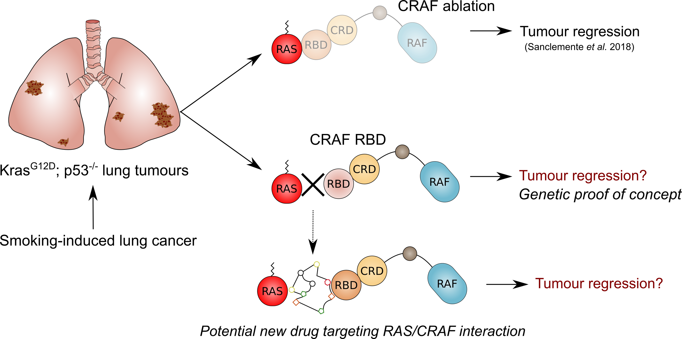 Currently, no specific treatments are available for these patients carrying a KRAS mutation. As the KRAS oncoprotein is involved in many cellular processes, it is extremely important to understand how it works, and what are the functions of its downstream effectors. Identifying and characterising new therapeutic targets allows for the design of new potent drugs with the potential of increasing patients survival. The CRAF kinase is a well described downstream effector of KRAS and a very attractive therapeutic target. Indeed, ablation of the protein in a mouse model of KRAS-driven lung cancer (similar to what happens in the patient) triggers tumour regression, with no apparent long term toxicity. However, although complete removal of a protein provides an excellent proof of concept of a new therapeutic target, it is hardly applicable for therapy.