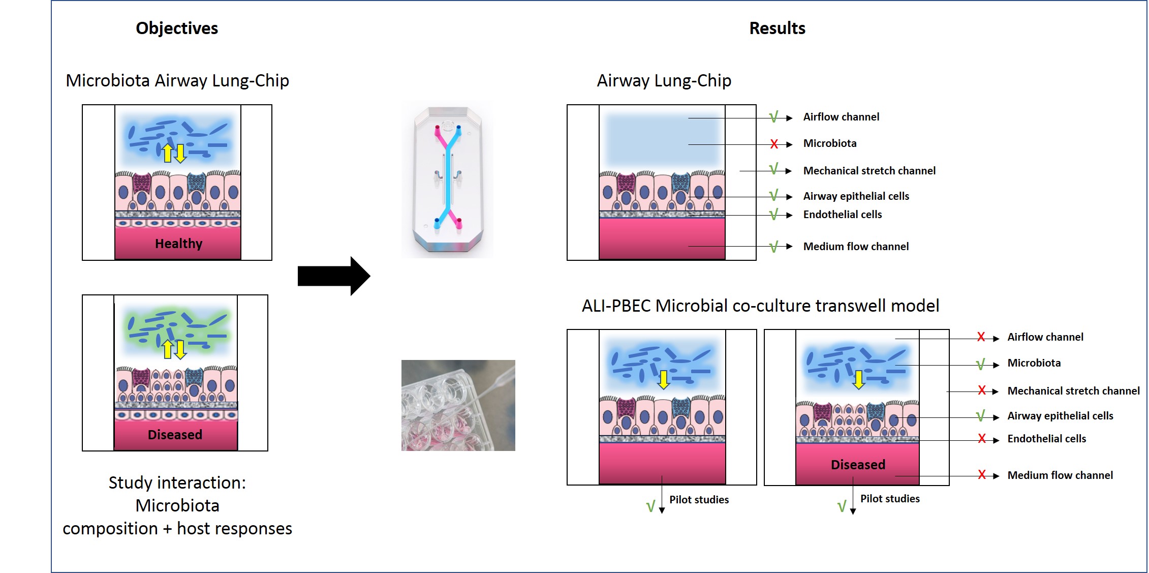 Original aim and objectives: This proposal is focused on the airway epithelium, a layer that lines the airways and plays a central role in protection against infection and regulating inflammation. The project aimed to develop an innovative human state-of-the-art Airway Lung-Chip microbiota co-culture model and use this model to investigate the interaction of the airway epithelium with the microbiota in a healthy and diseased environment and investigate how these interactions contribute to susceptibility for infection. This knowledge will be of significant importance to elucidate the mechanisms that underlie the observed changes in airway epithelial composition and airway microbiota composition in patients with COPD. This knowledge could be applied to future research efforts that will contribute to the development of more effective healthcare strategies for COPD.