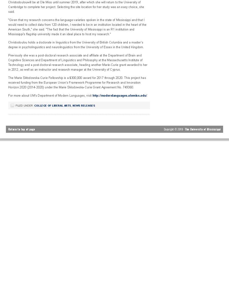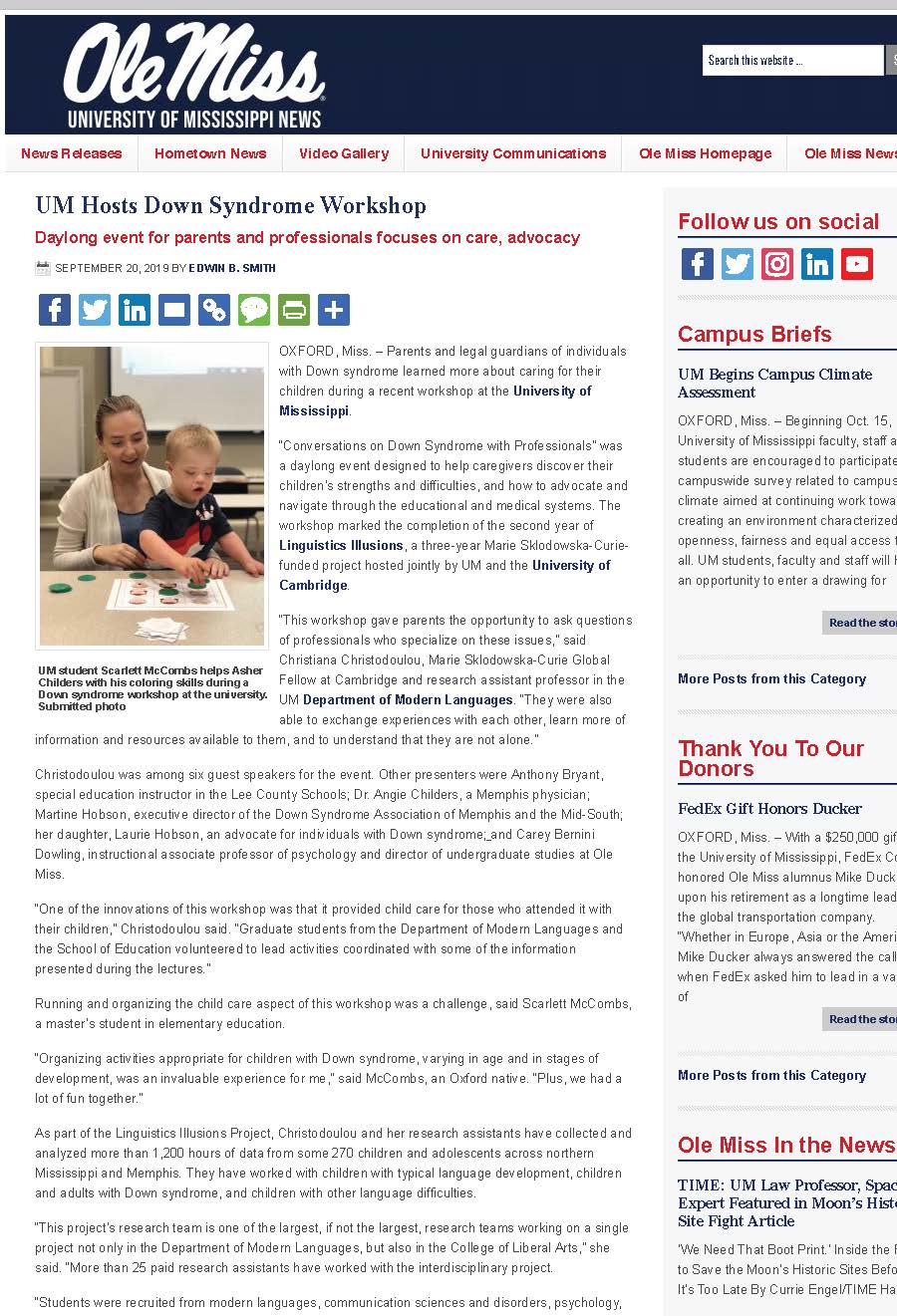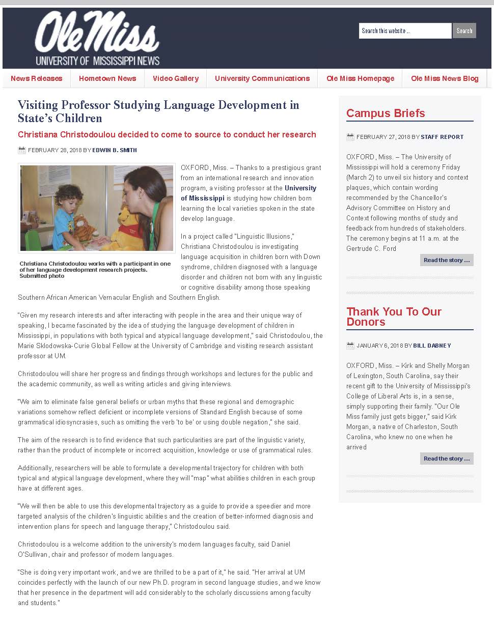 Results from the project thus far have revealed a critical need for re-evaluation of the existing educational and clinical assessment systems currently in place in Mississippi and perhaps non-standard varieties of English in general, as well as the tools utilized to assess the linguistic and cognitive abilities of these children. We anticipate that the current study will have an invaluable impact on the process of diagnosis and treatment. Establishing the nature of grammatical differences between what is intended/expected and what is actually produced will help prevent over- or under-diagnosis and assist with more efficient intervention plans. The State of Mississippi is ranked amongst the lowest in terms of education and academic achievement. Knowing the true nature of the problem will help clarify what type of reformations are needed within the educational and diagnostic system to promote more efficient learning and better academic performance for the 2 varieties of English and other languages spoken across Europe and beyond. Publicising the results of this study assists in social and educational inclusion and the efficient integration of children speaking the SE and Southern AAE varieties, not only during primary and secondary education but also tertiary education. The outreach initiatives we have pursued thus far, serve as a precursor of the greater impact this study has on the local community and beyond.