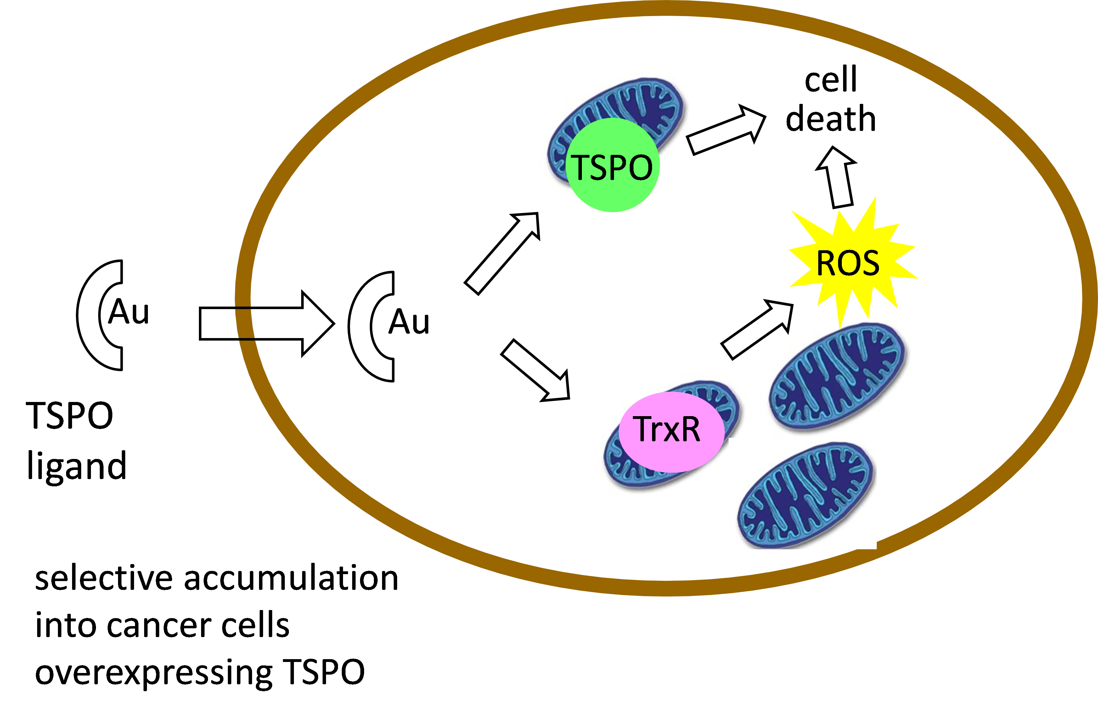 Cancer cells becoming resistant in the course of treatment is a major challenge in cancer chemotherapy. Anticancer agents that target the mitochondria have the potential to bypass resistance mechanisms and to (re )activate cell death pathways that are mutated or lacking in cancer cells. They are also anticipated to act selectively on tumor cells, as these have a deregulated mitochondrial metabolism. TSPO is a relatively small protein located at the outer mitochondrial membrane and is overexpressed in many tumors. It plays a fundamental role in mitochondrial biochemistry and has a regulatory function in mitochondria-mediated cell death pathways. Thioredoxin reductase (TrxR) is a key enzyme for the maintenance of the cellular redox balance and has a mitochondrial isoform. Its inhibition leads to an increase in reactive oxygen species (ROS) and to a decrease in mitochondrial thiols, both events that trigger cell death. The antitumor activity of many gold complexes is due to the ability of gold(I) to inhibit TrxR.